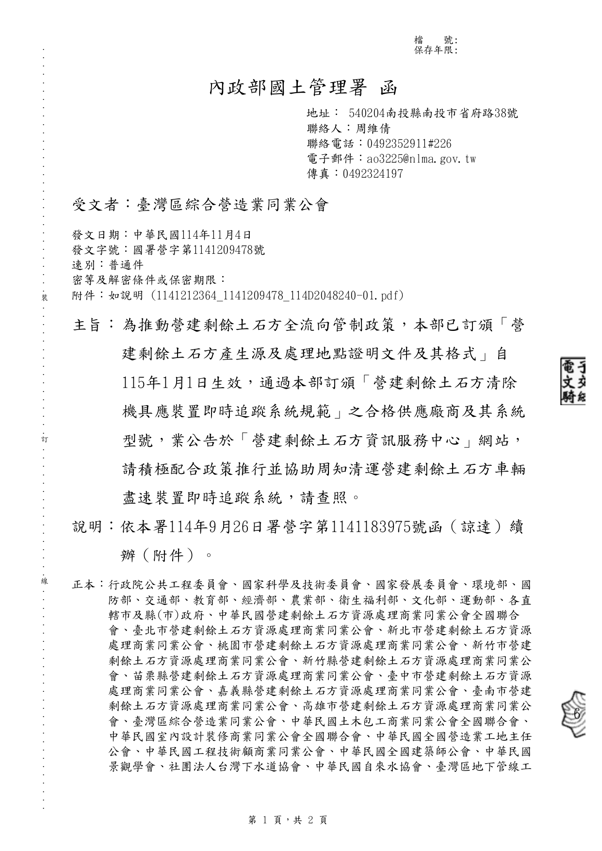 內政部國土管理署 114.11.4 國署營字第1141209478號函