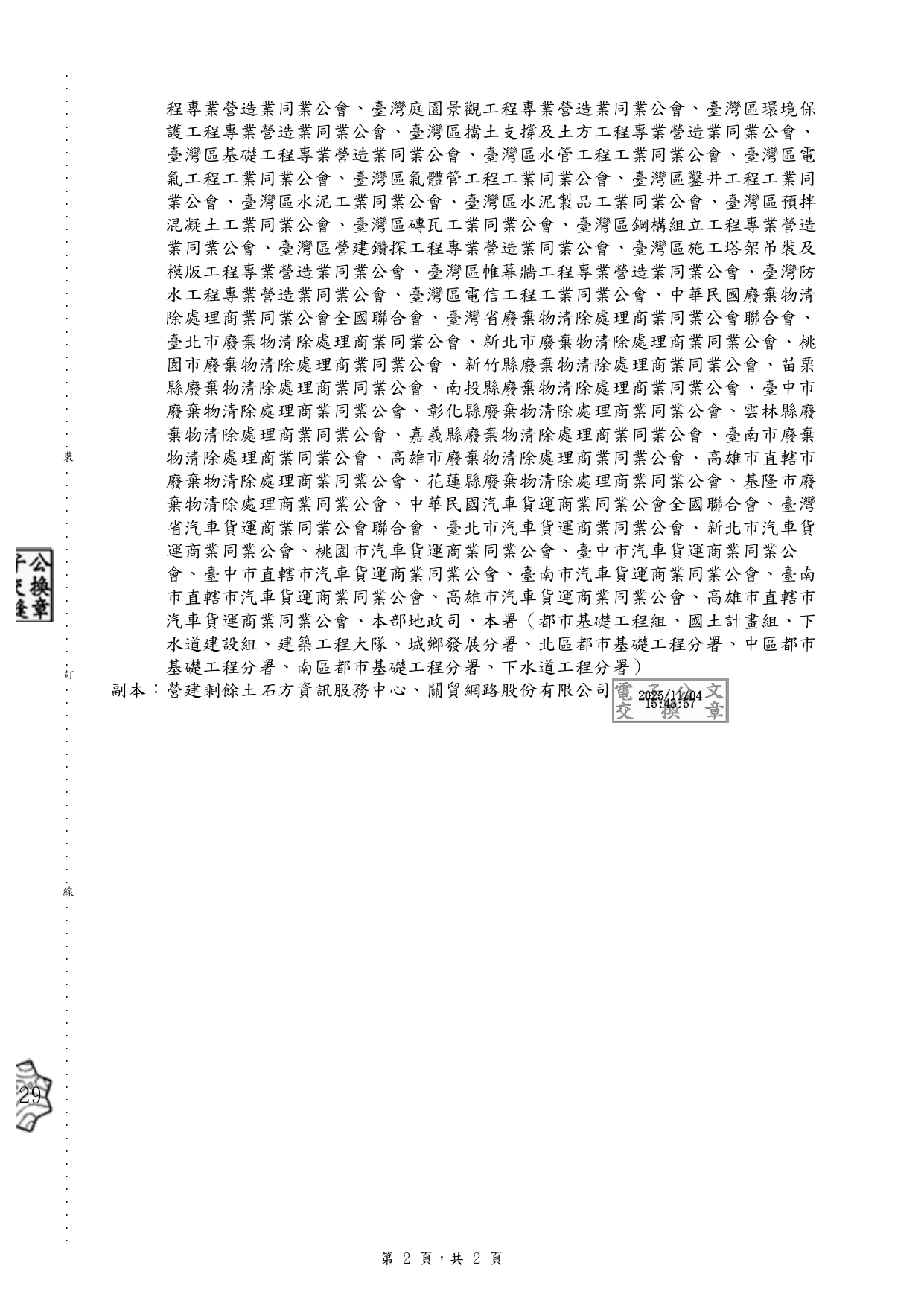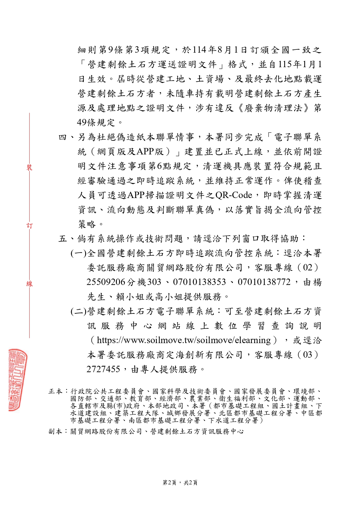 有關為推動營建剩餘土石方全流向管制政策, 內政部已訂頒「營建剩餘土石方產生源及處理地點證明文件及其格式」自115年1月1日生效,通過內政部訂頒「營建剩餘土石方清除機具應裝置即時追蹤系統規範」之合格供應廠商及其系統型號,業公告於「營建剩餘土石方資訊服務中心」網站,請積極配合政策推行並協助周知清運營建剩餘土石方車輛盡速裝置即時追蹤系統,請查收。