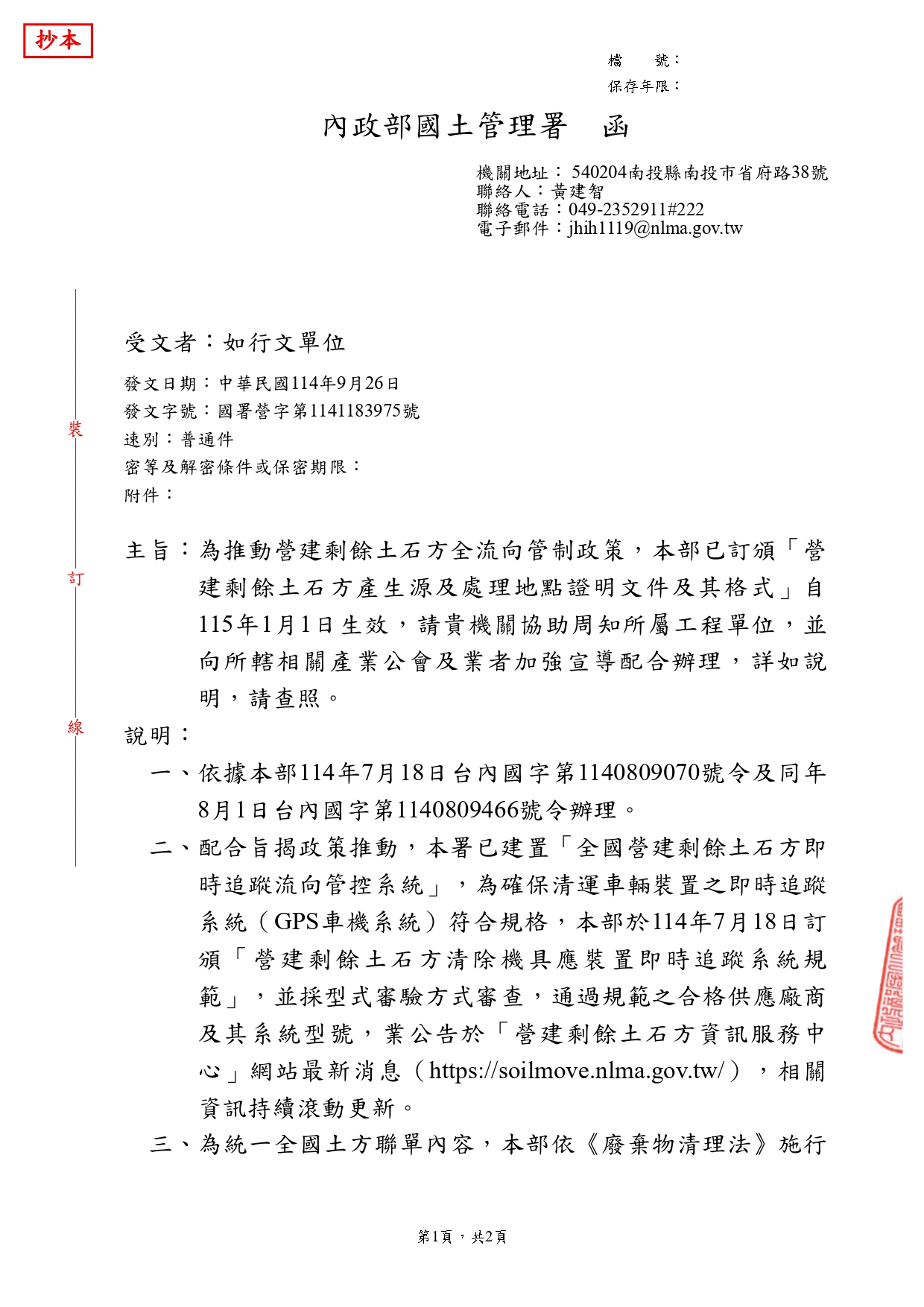 國土署 有關為推動營建剩餘土石方全流向管制政策, 內政部已訂頒「營建剩餘土石方產生源及處理地點證明文件及其格式」自115年1月1日生效