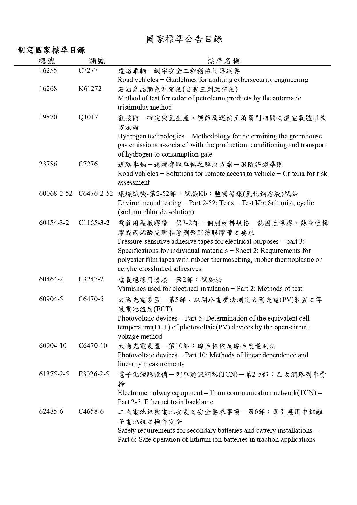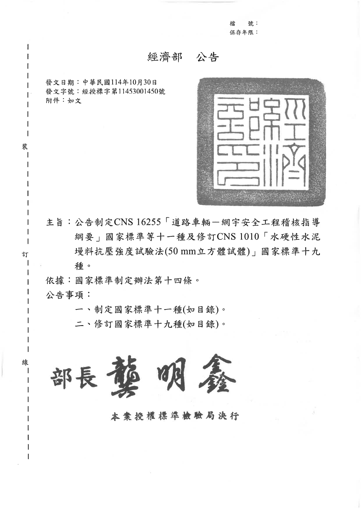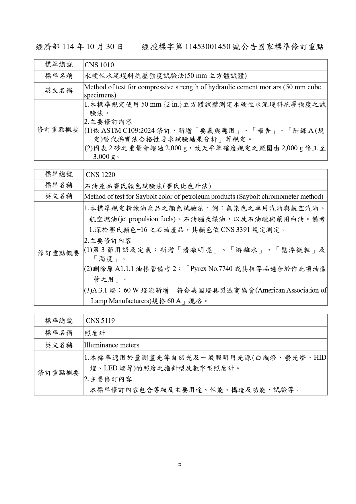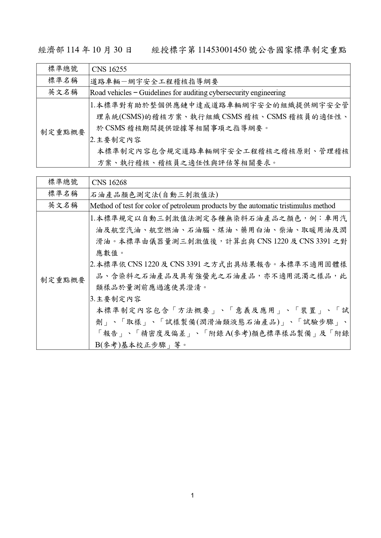 經濟部114年10月30日經授標字第11453001450號公告國家標準(含制定及修訂重點,如附件) 2025-11-25 檔案下載 經濟部標準檢驗局 114.11.18 經標標準字第11420020320號函 檢送經濟部114年10月30日經授標字第11453001450號公告國家標準(含制定及修訂重點,如附件)