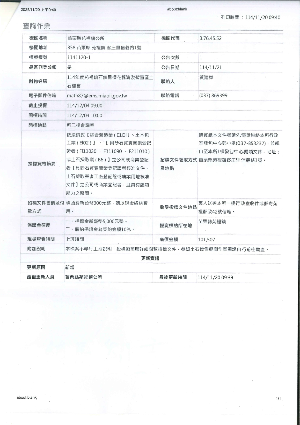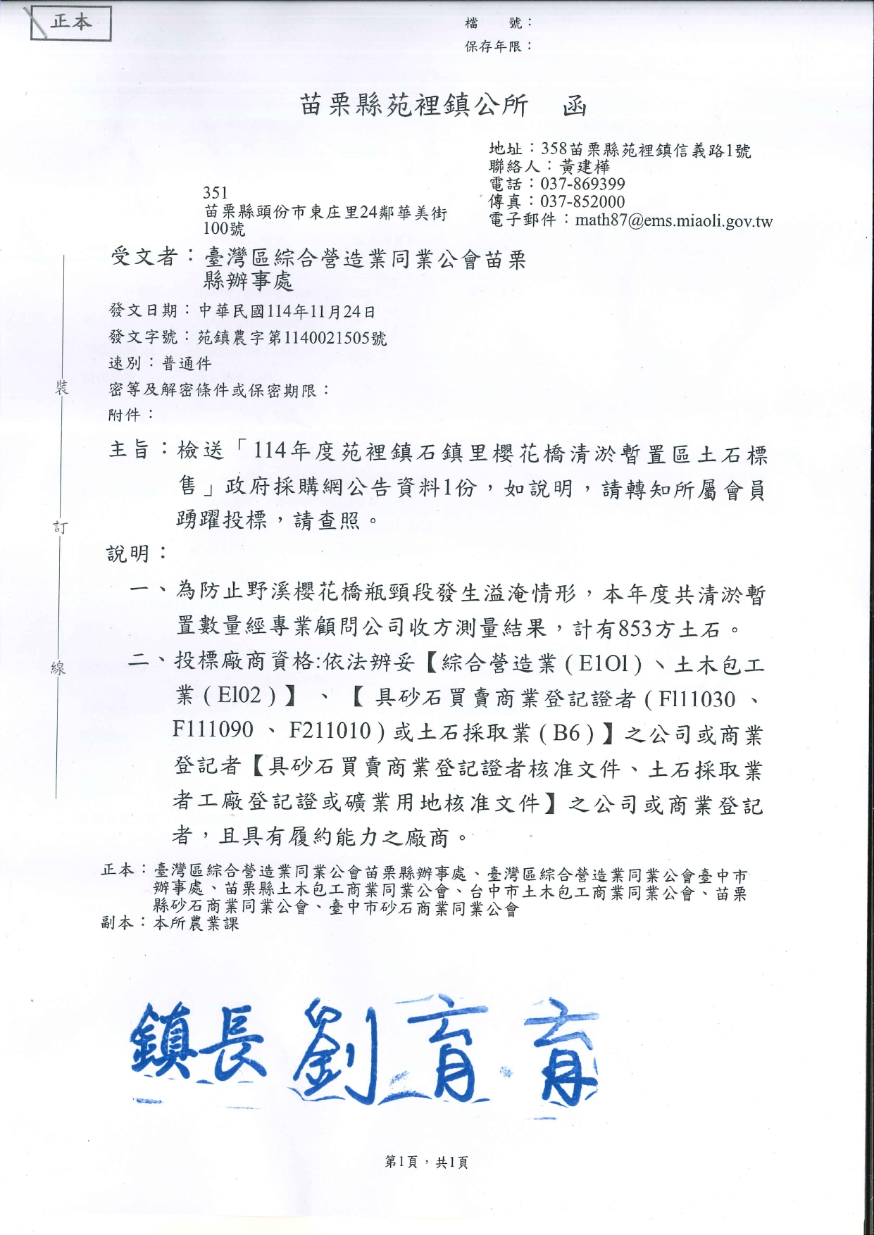苗栗縣苑裡鎮公所 「114年度苑裡鎮石鎮里櫻花橋清淤暫置區土石標售」政府採購網公告資料一份 2025-11-26 檔案下載 苗栗縣苑裡鎮公所 114.11.24 苑鎮農字第1140021505號 檢送「114年度苑裡鎮石鎮里櫻花橋清淤暫置區土石標售」政府採購網公告資料一份,如說明, 請會員踴躍參與投標。