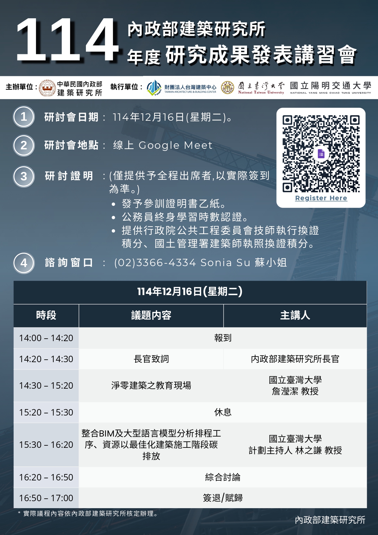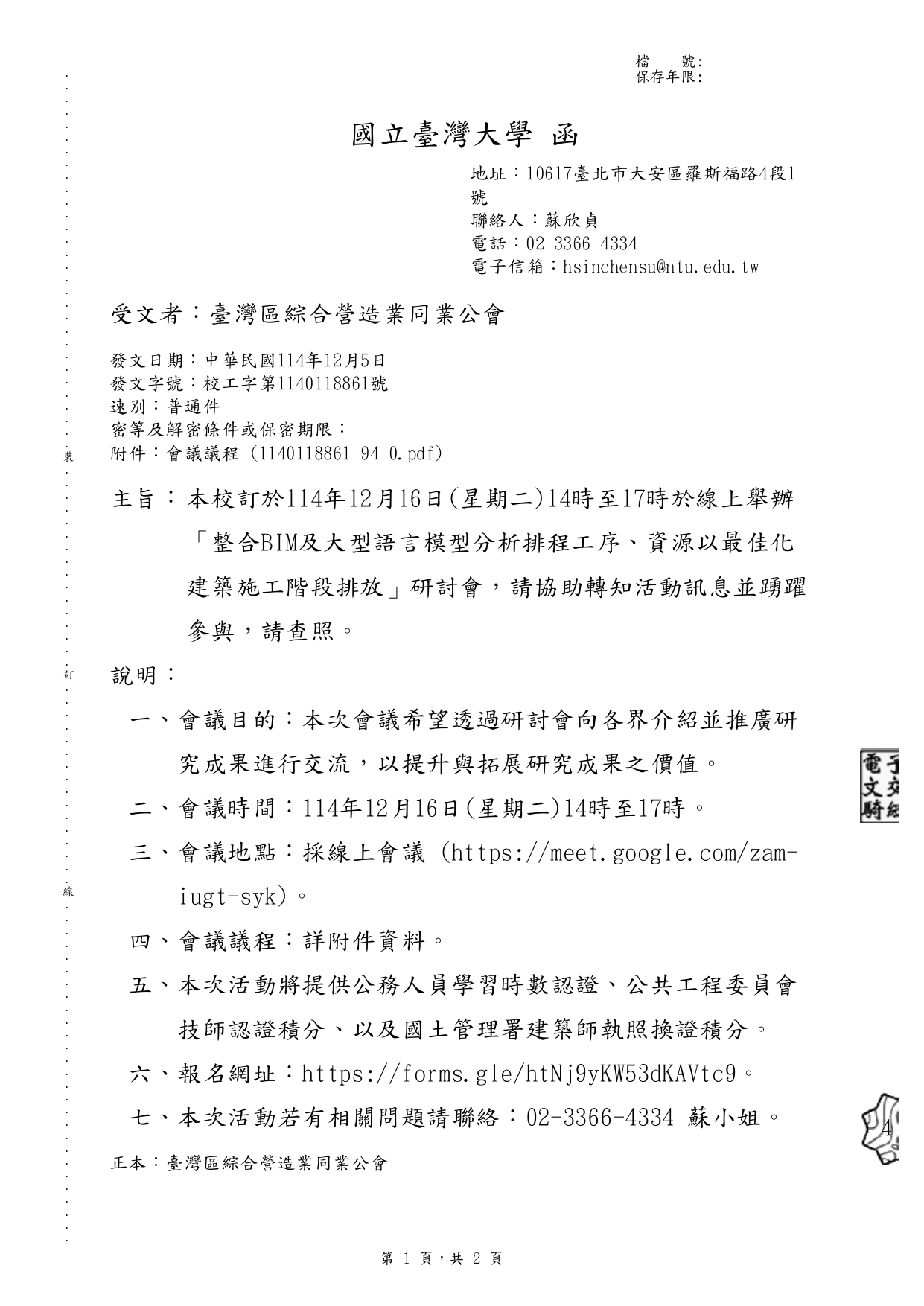 有關國立臺灣大學訂於114年12月16日(星期二)14時至17時於線上舉辦「整合BIM及大型語言模型分析排程工序、資源以最佳化建築施工階段排放」研討會。