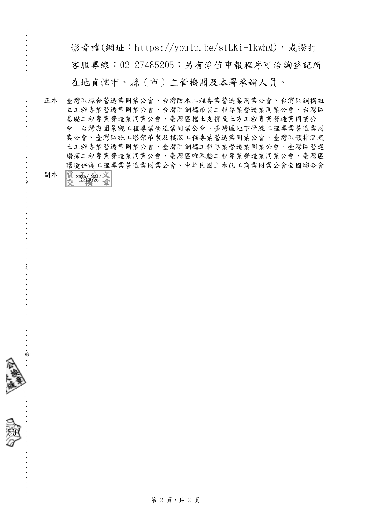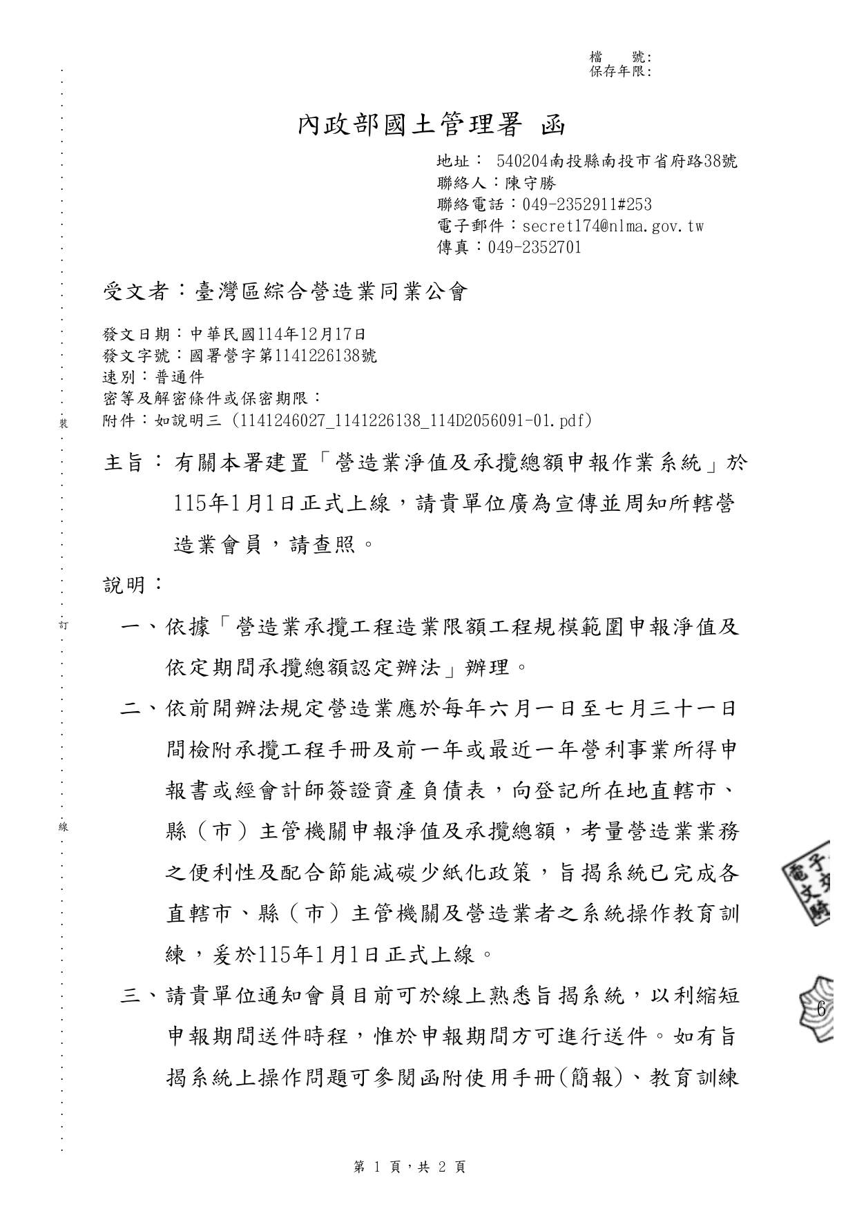 有關內政部國土管理署建置「營造業淨值及承攬總額申報作業系統」於115年1月1日正式上線,請轉知轄區會員廣為宣傳。