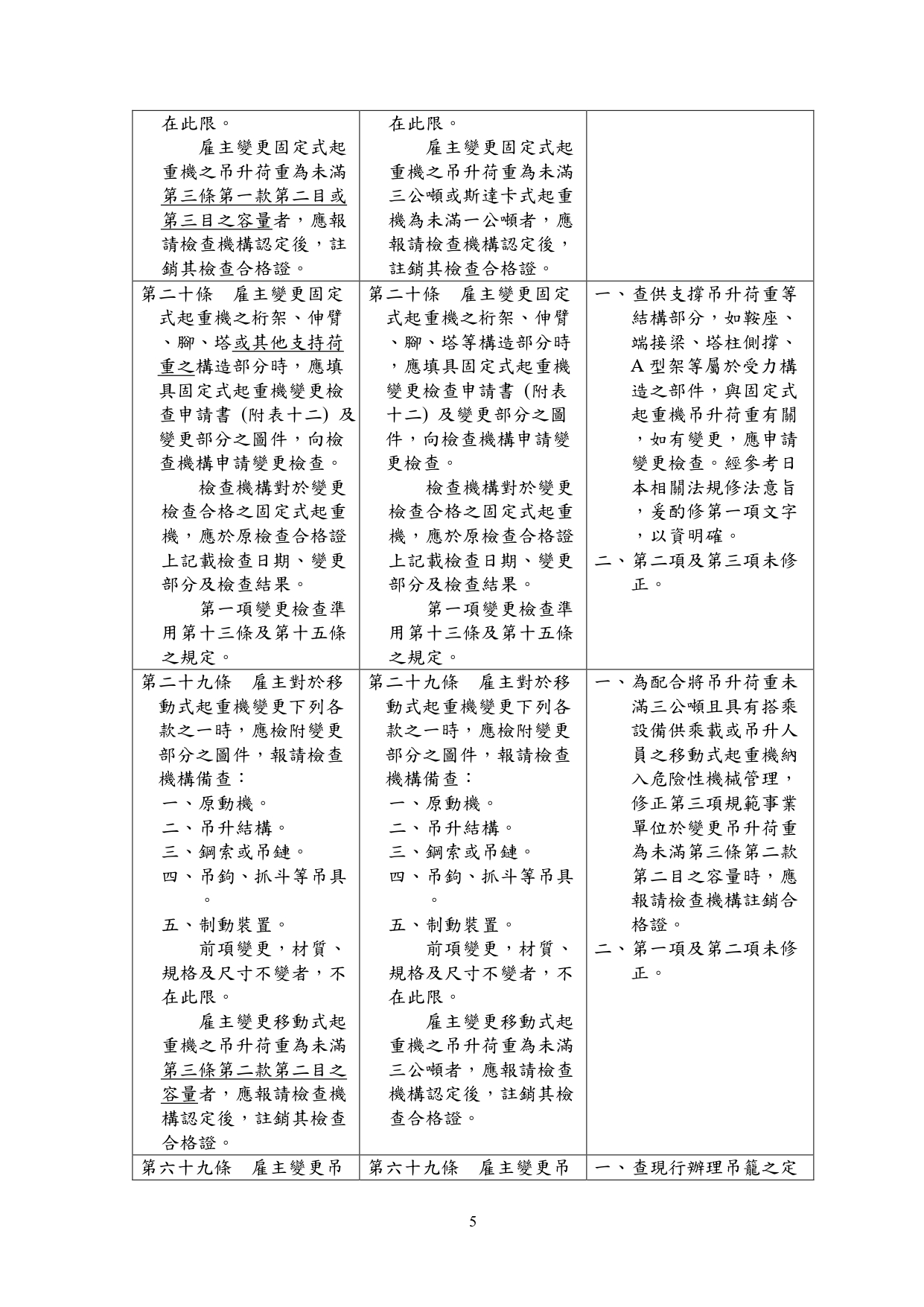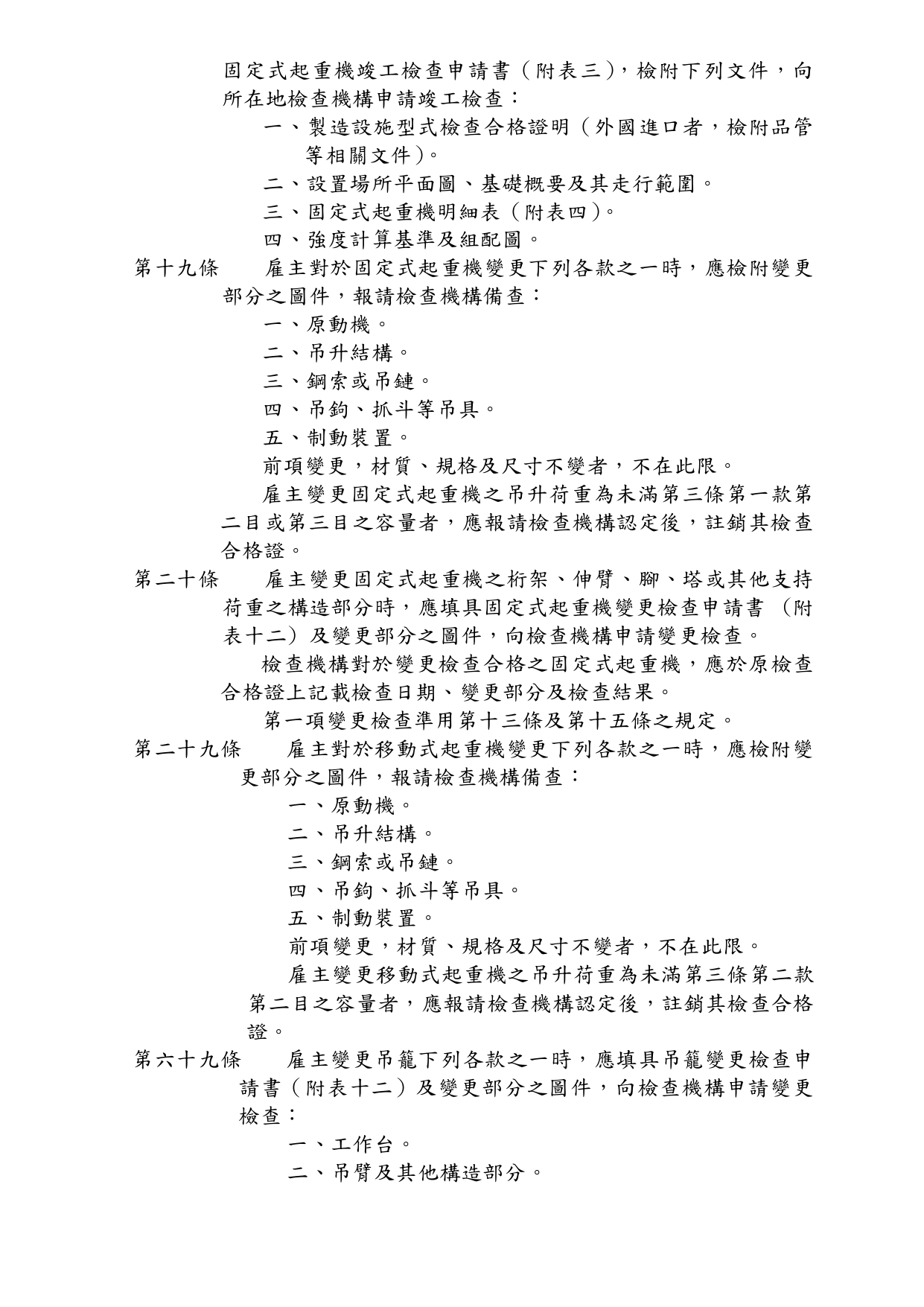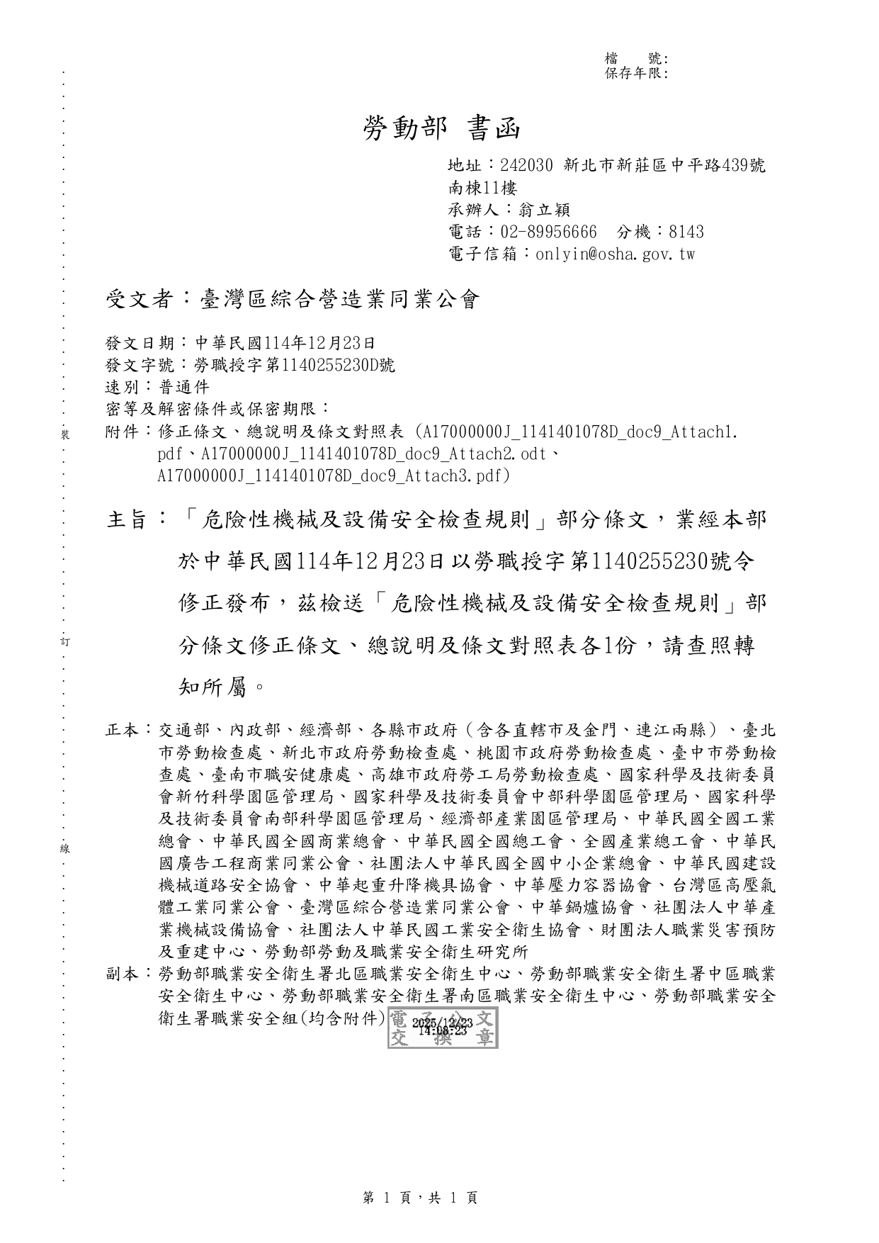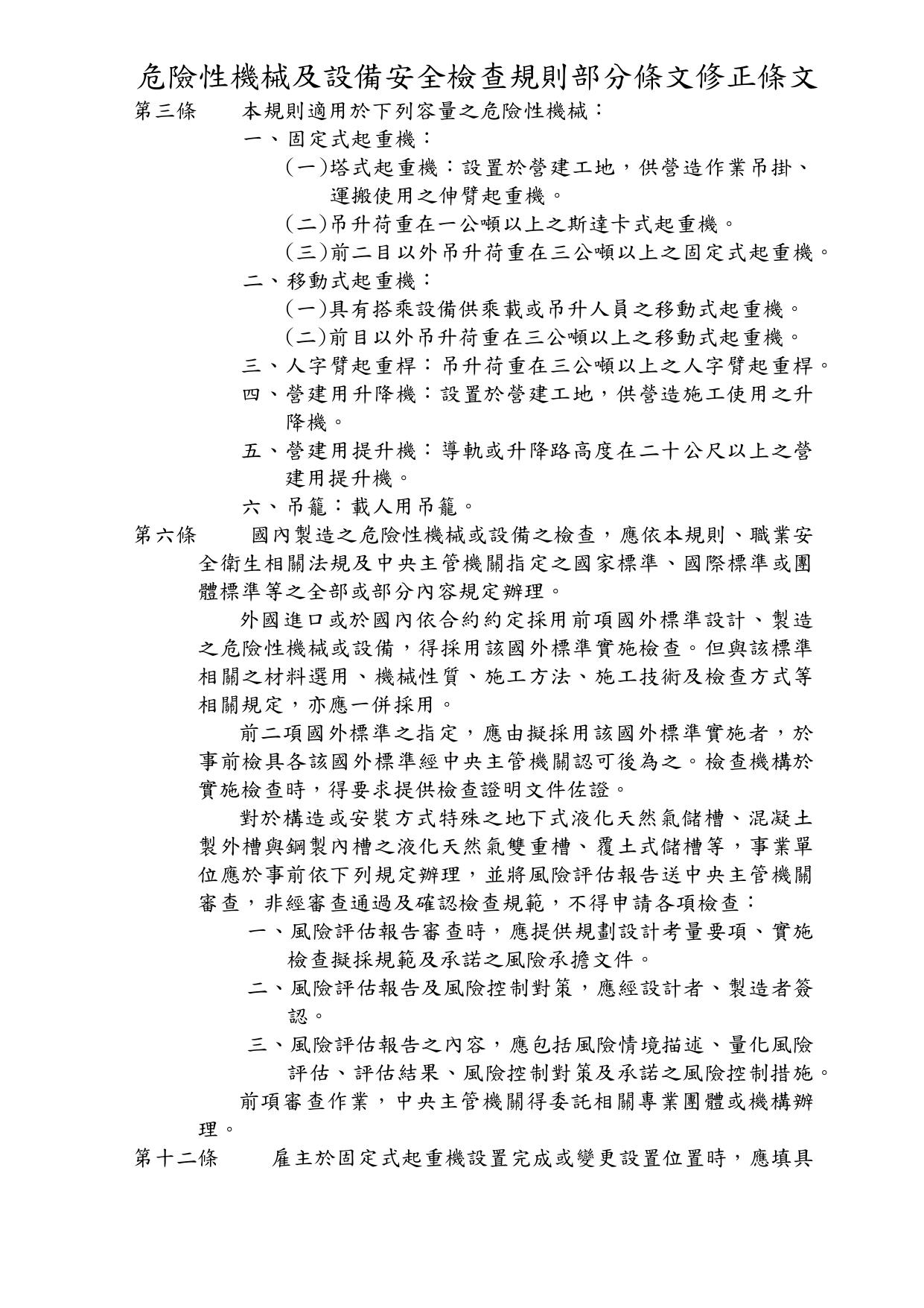 勞動部 「危險性機械及設備安全檢查規則」部分條文修正條文、總說明及條文對照表各1份 2025-12-29 檔案下載 勞動部 114.12.23 勞職授字第1140255230D號函 有關「危險性機械及設備安全檢查規則」部分條文,業經本部於中華民國114年12月23日以勞職授字第1140255230號令修正發布,茲檢送「危險性機械及設備安全檢查規則」部分條文修正條文、總說明及條文對照表各1份