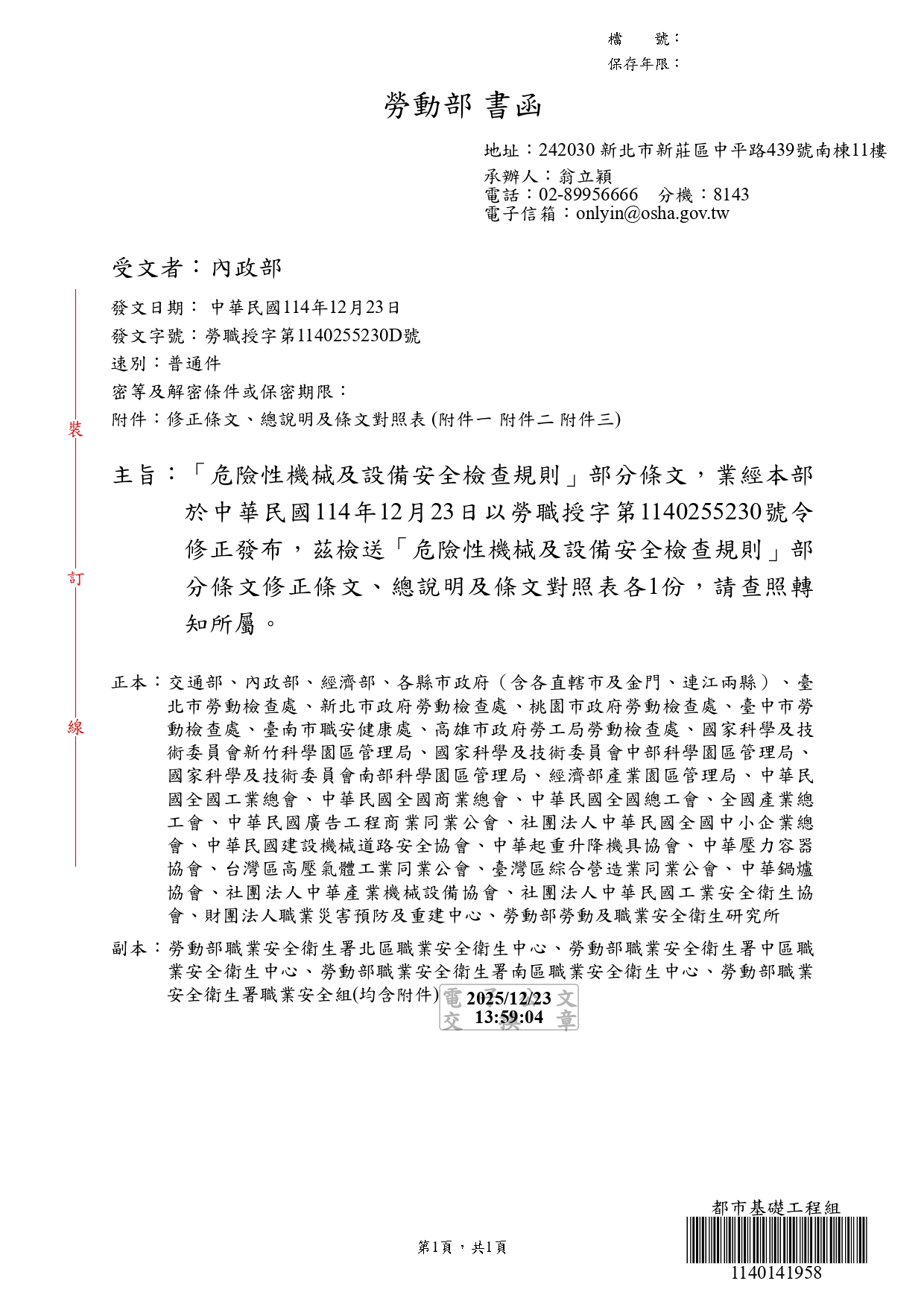 轉知勞動部於中華民國114年12月23日以勞職授字第1140255230號令發布修正「危險性機械及設備安全檢查規則」部分條文