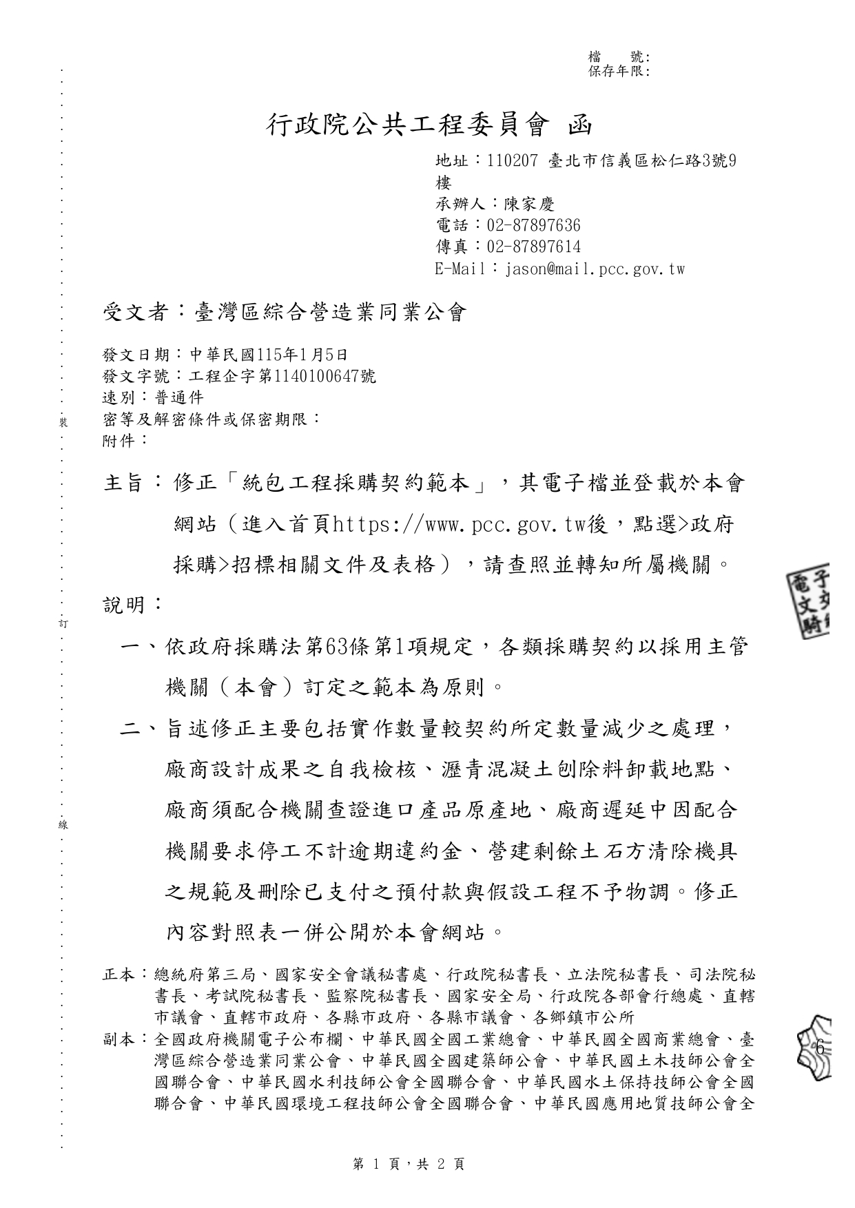 行政院公共工程委員會 有關修正「統包工程採購契約範本」 2026-01-12 檔案下載 行政院公共工程委員會 115.1.5 工程企字第1140100647號函 有關修正「統包工程採購契約範本」,其電子檔並登載於行政院公共工程委員會網站(進入首頁https://www.pcc.gov.tw後,點選>政府採購>招標相關文件及表格)