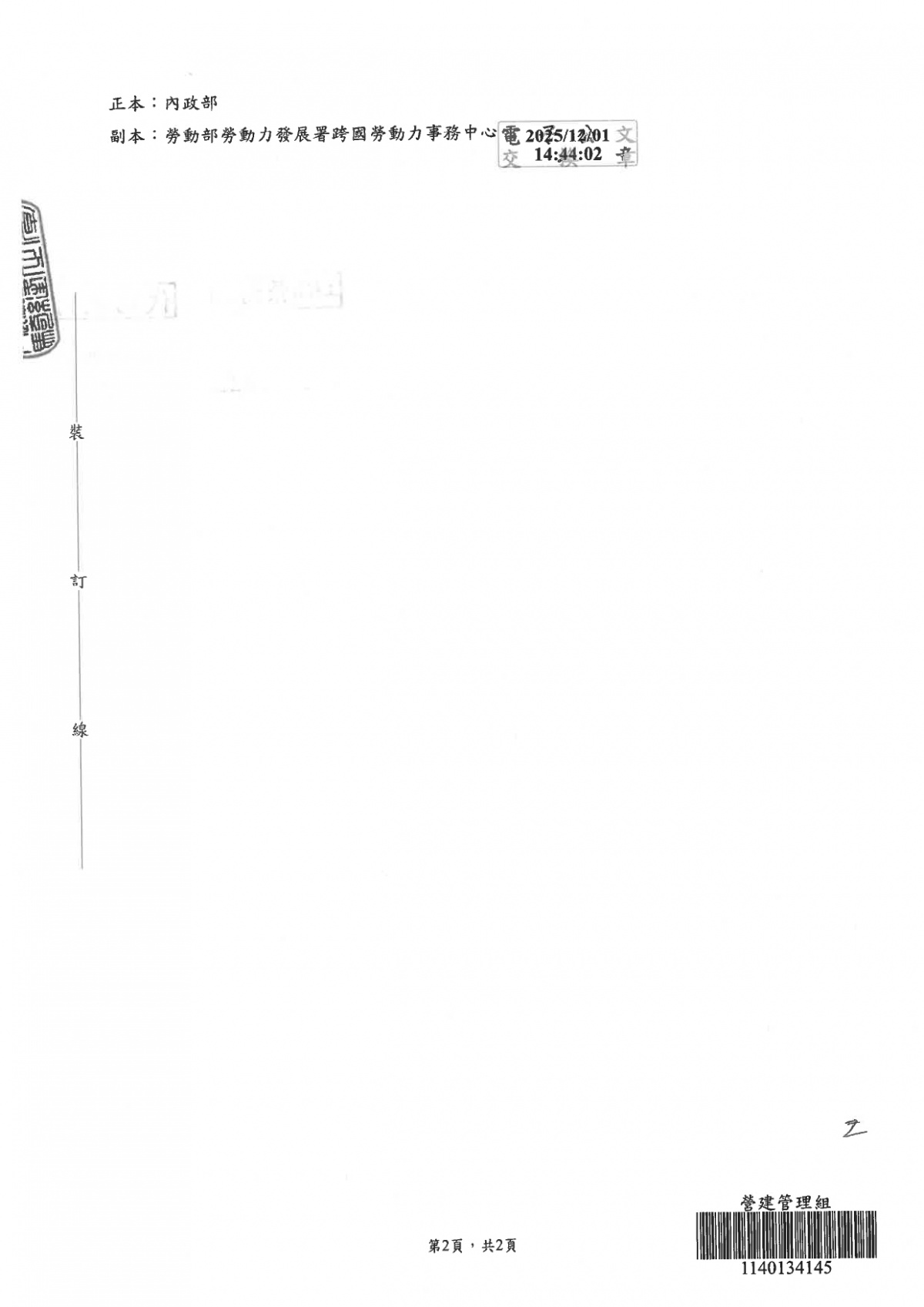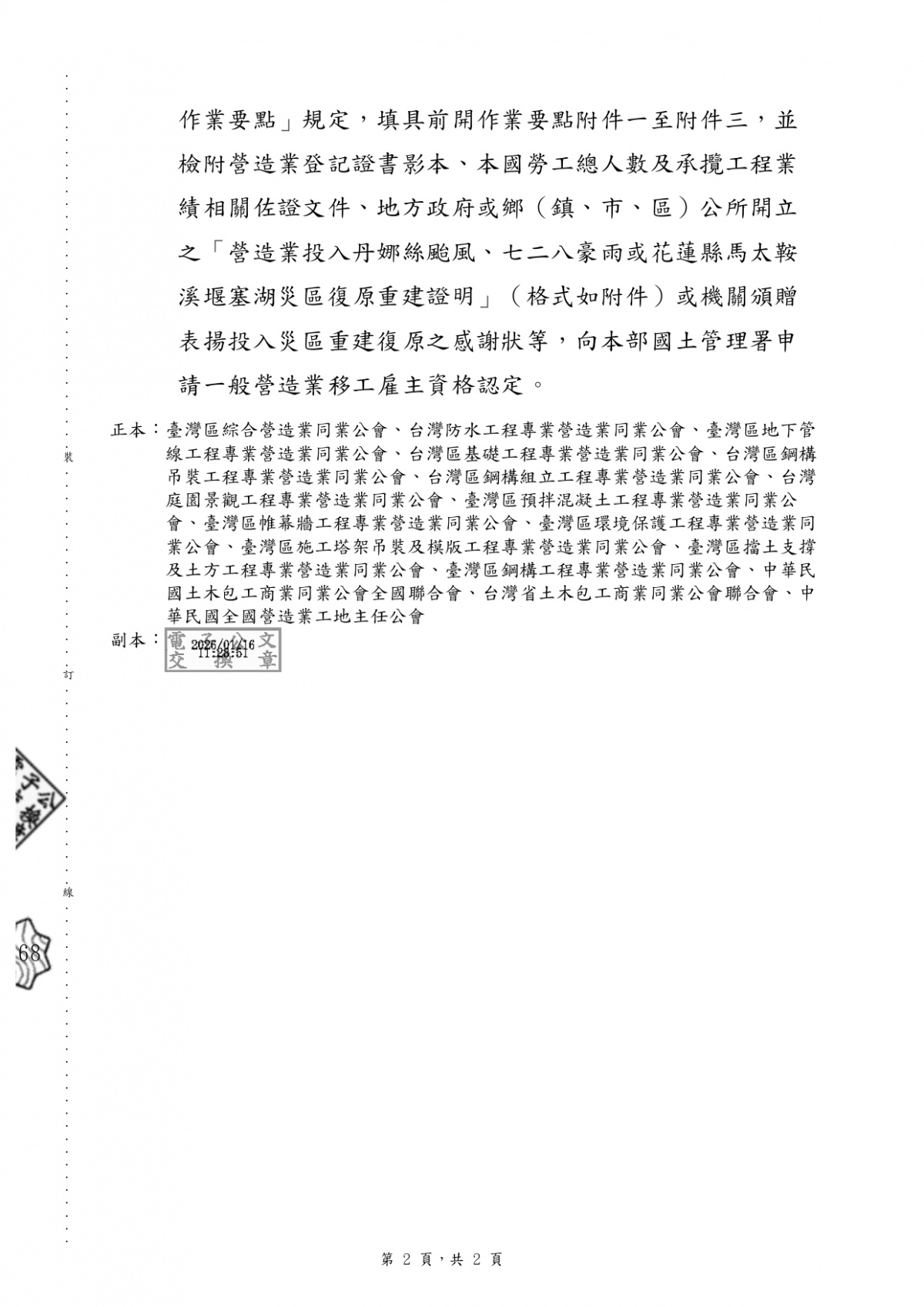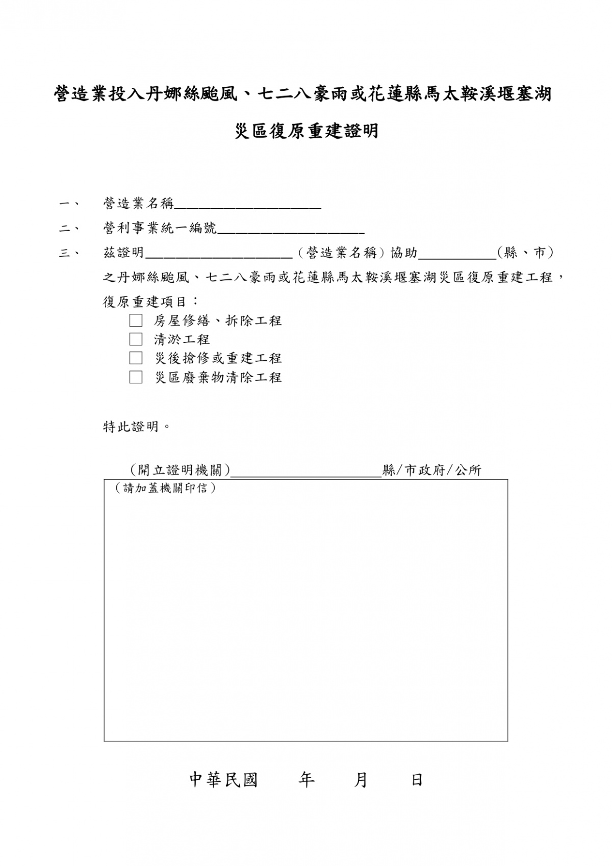 勞動部同意開放協助丹娜絲颱風、七二八豪雨或花蓮縣馬太鞍溪堰塞湖災區復原重建之營造業者得申請一般營造業移工名額1案 2026-01-22 檔案下載 內政部 115.1.16 台內國字第1150800125號函 有關勞動部同意開放協助丹娜絲颱風、七二八豪雨或花蓮縣馬太鞍溪堰塞湖災區復原重建之營造業者得申請一般營造業移工名額1案