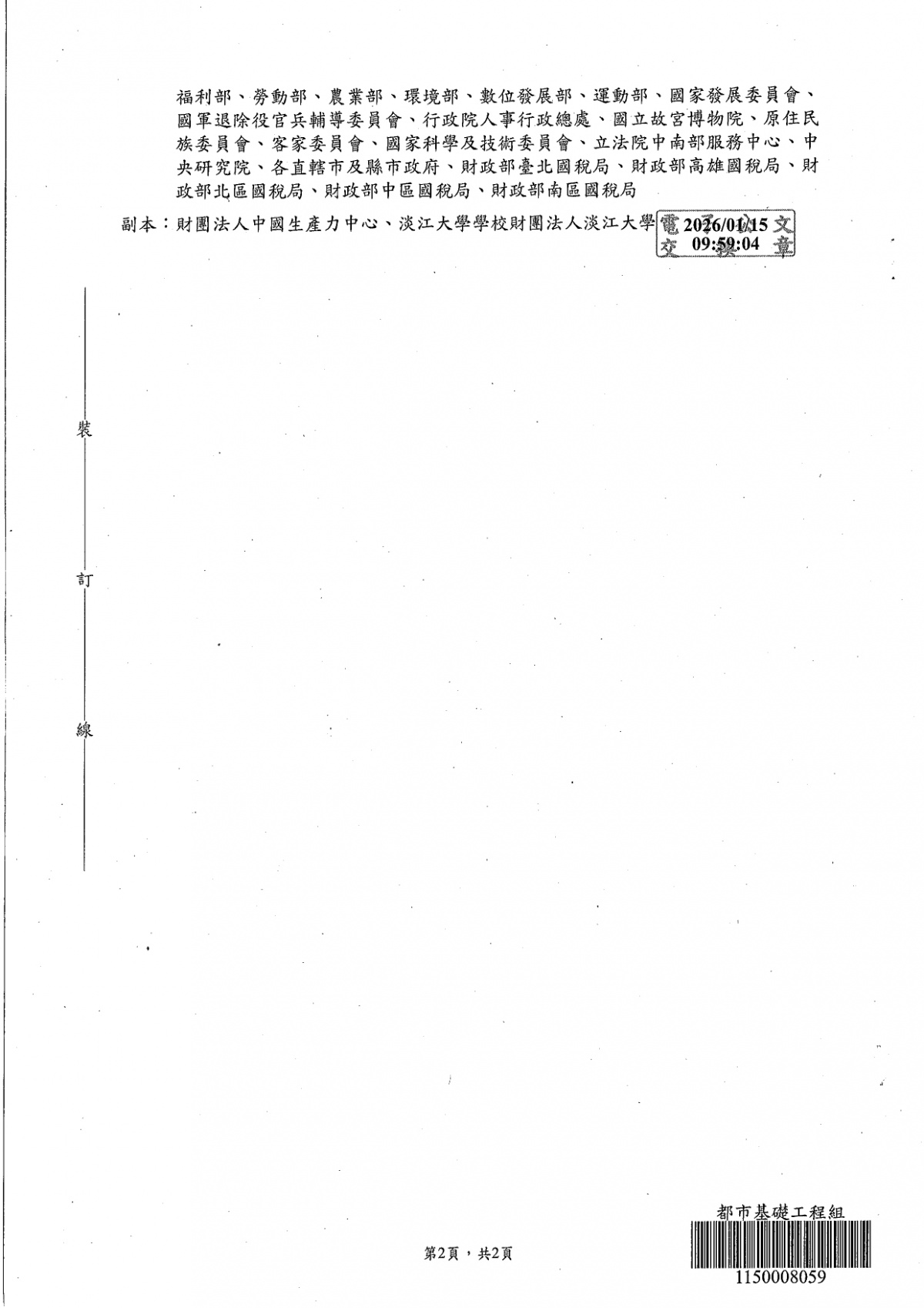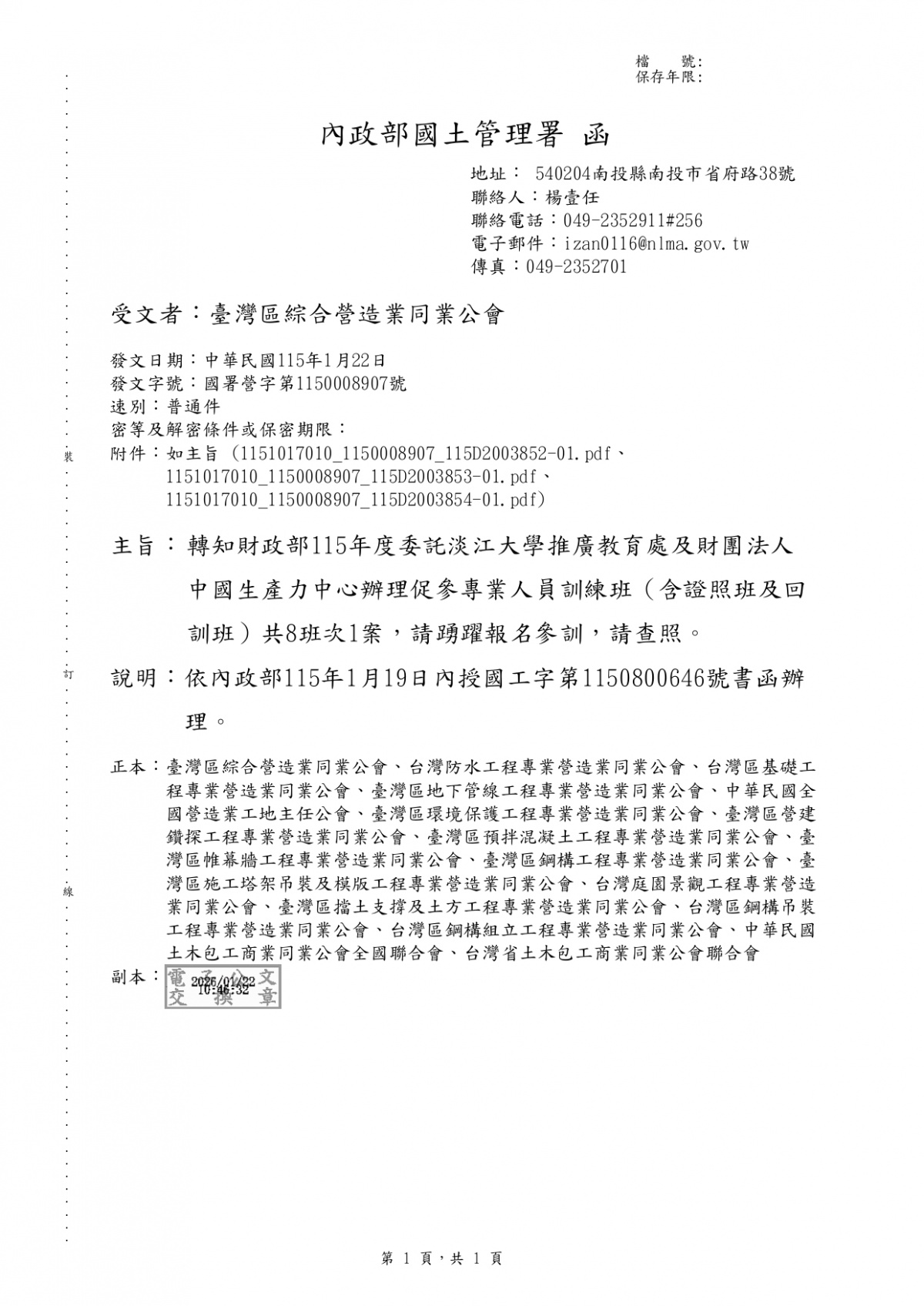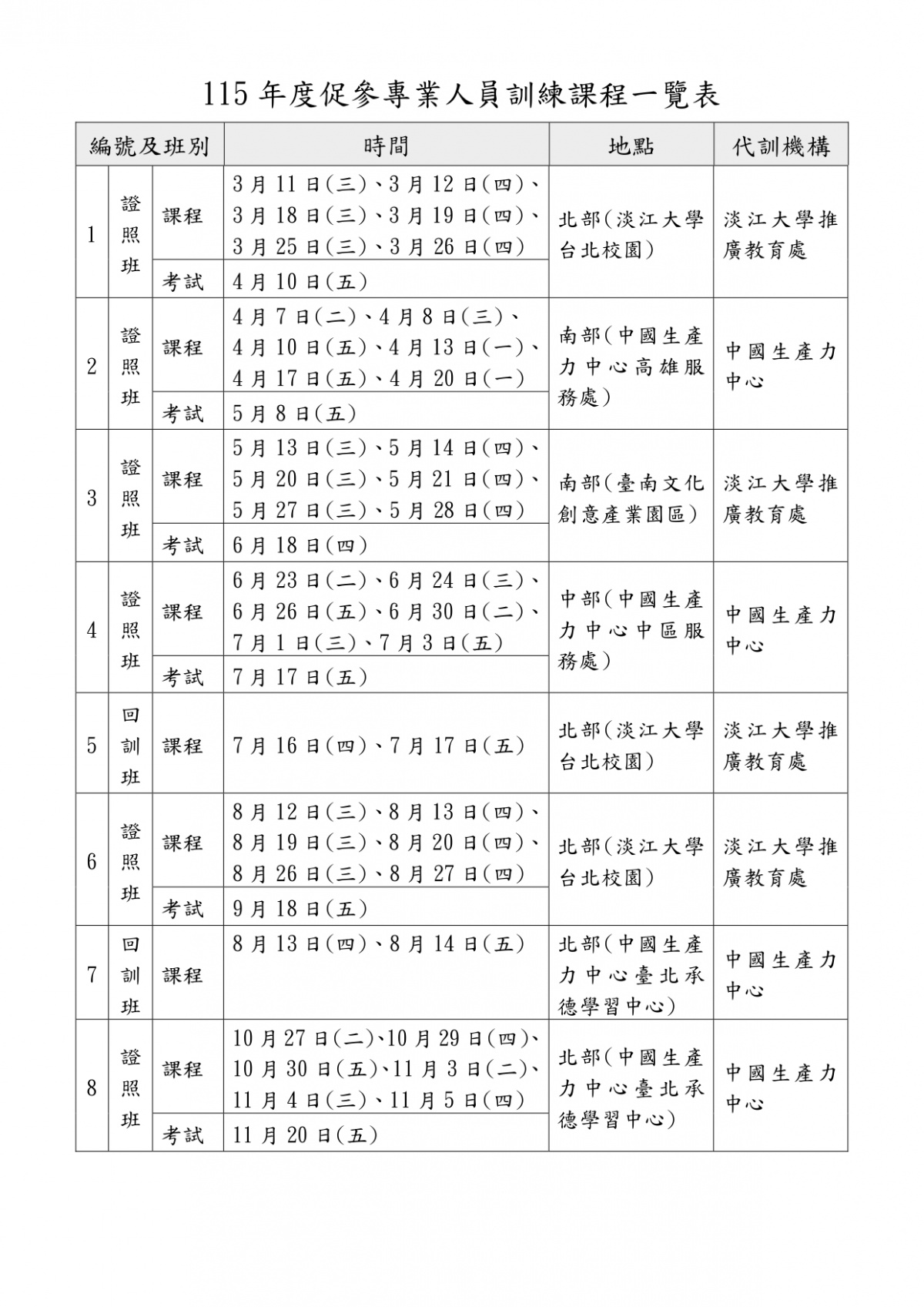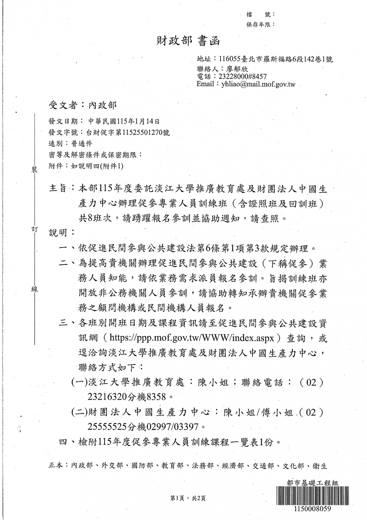 財政部115年度委託淡江大學推廣教育處及財團法人中國生產力中心辦理促參專業人員訓練班(含證照班及回訓班)共8班次1案 2026-01-26 檔案下載 內政部國土管理署 115.1.22 國署營字第1150008907號函 轉財政部115年度委託淡江大學推廣教育處及財團法人中國生產力中心辦理促參專業人員訓練班(含證照班及回訓班)共8班次1案,請踴躍報名參訓