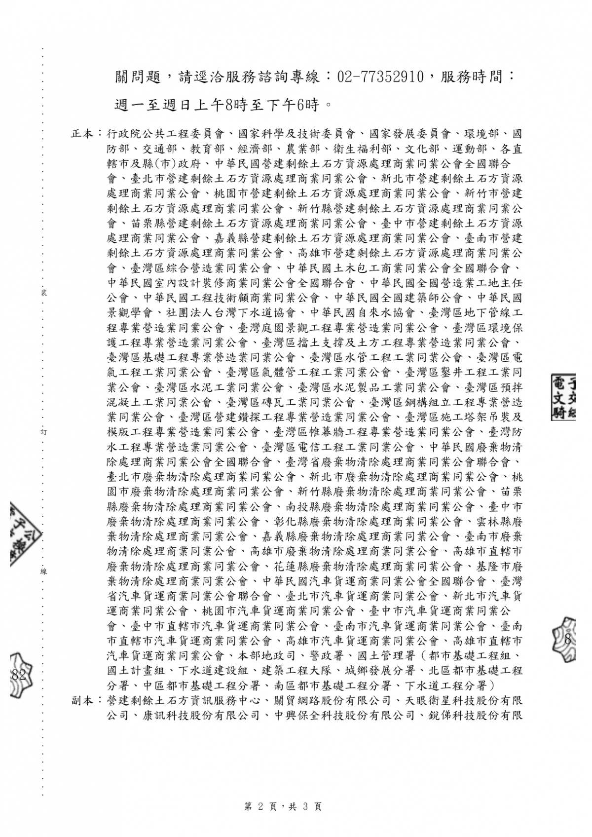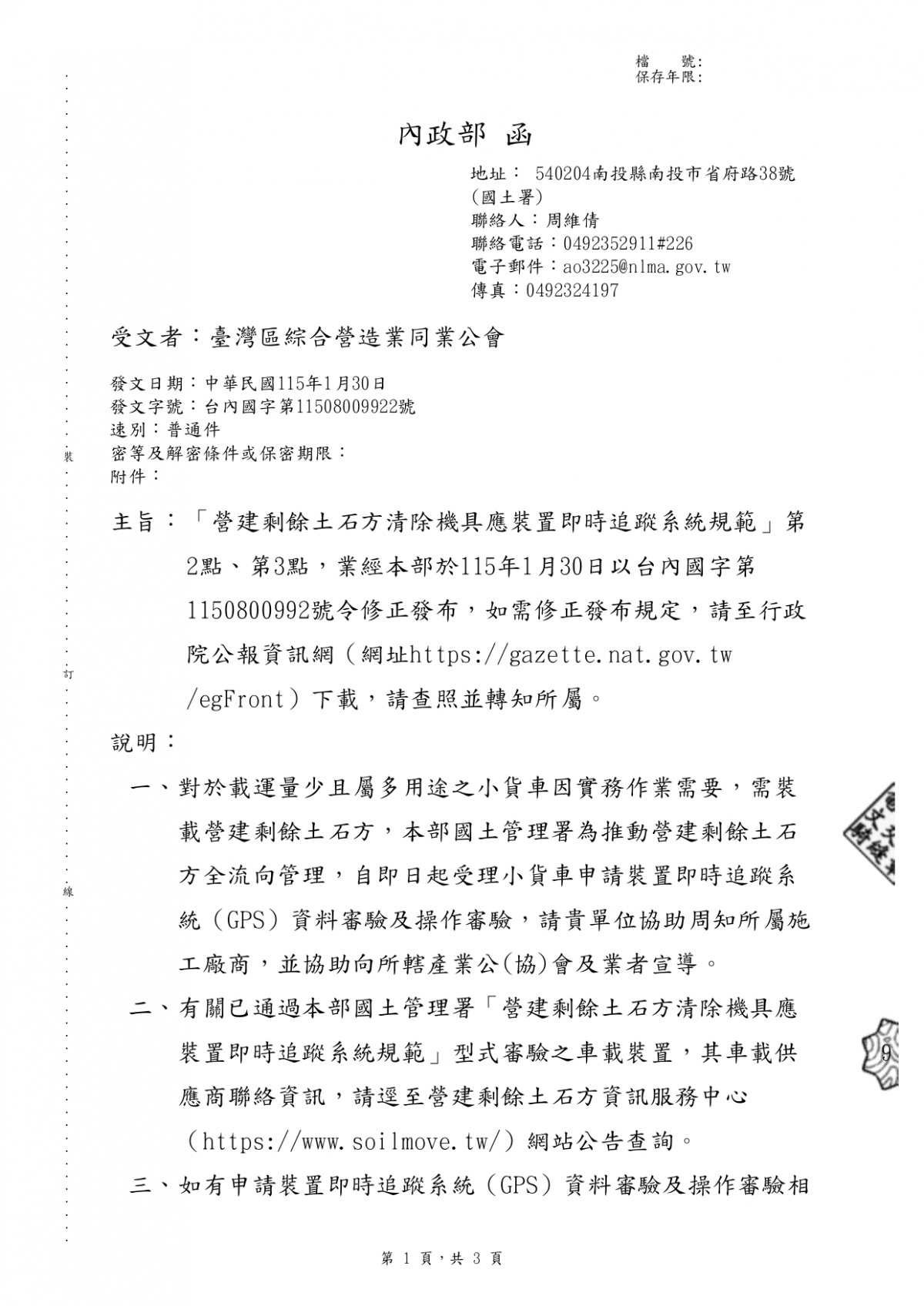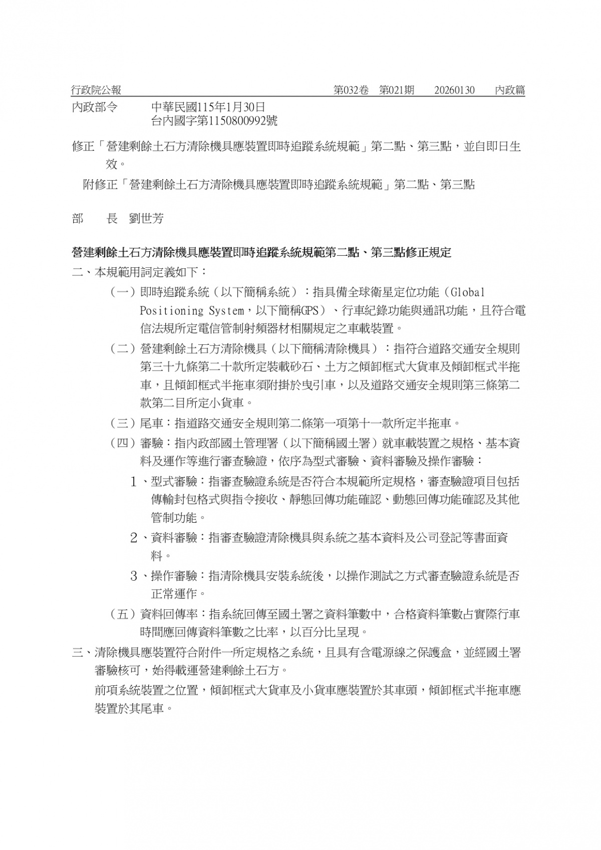 有關「營建剩餘土石方清除機具應裝置即時追蹤系統規範」第2點、第3點,業經本部於115年1月30日以台內國字第1150800992號令修正發布 2026-02-03 檔案下載 內政部 115.1.30 台內國字第11508009922函 有關「營建剩餘土石方清除機具應裝置即時追蹤系統規範」第2點、第3點,業經本部於115年1月30日以台內國字第1150800992號令修正發布,如需修正發布規定, 請至行政院公報資訊網(網址:https://gazette.nat.gov.tw/egFront)下載