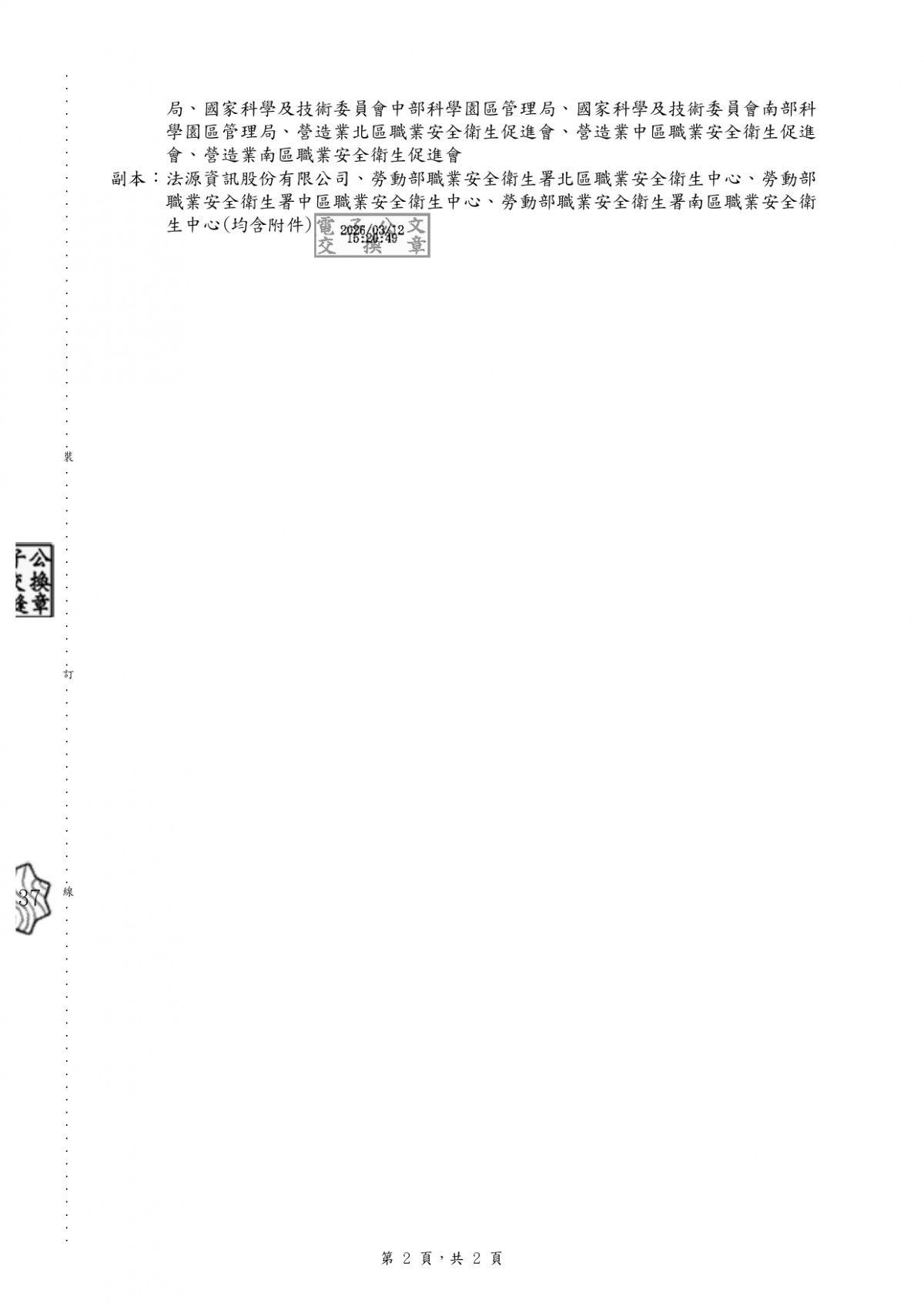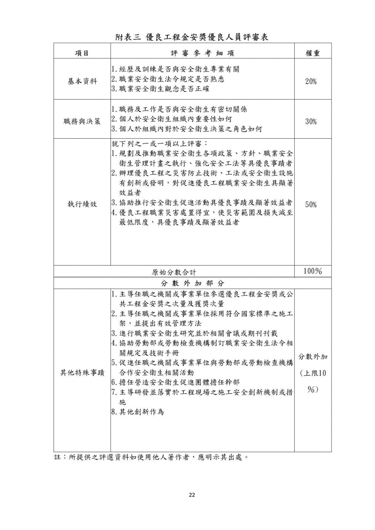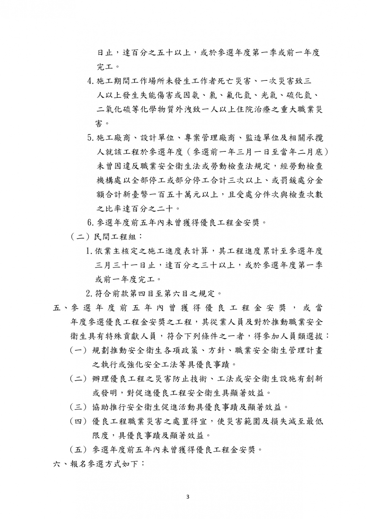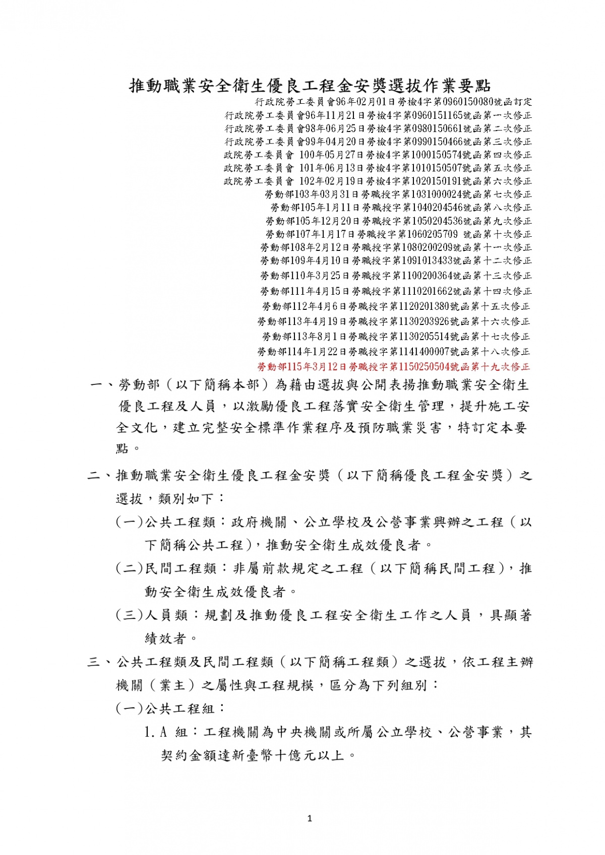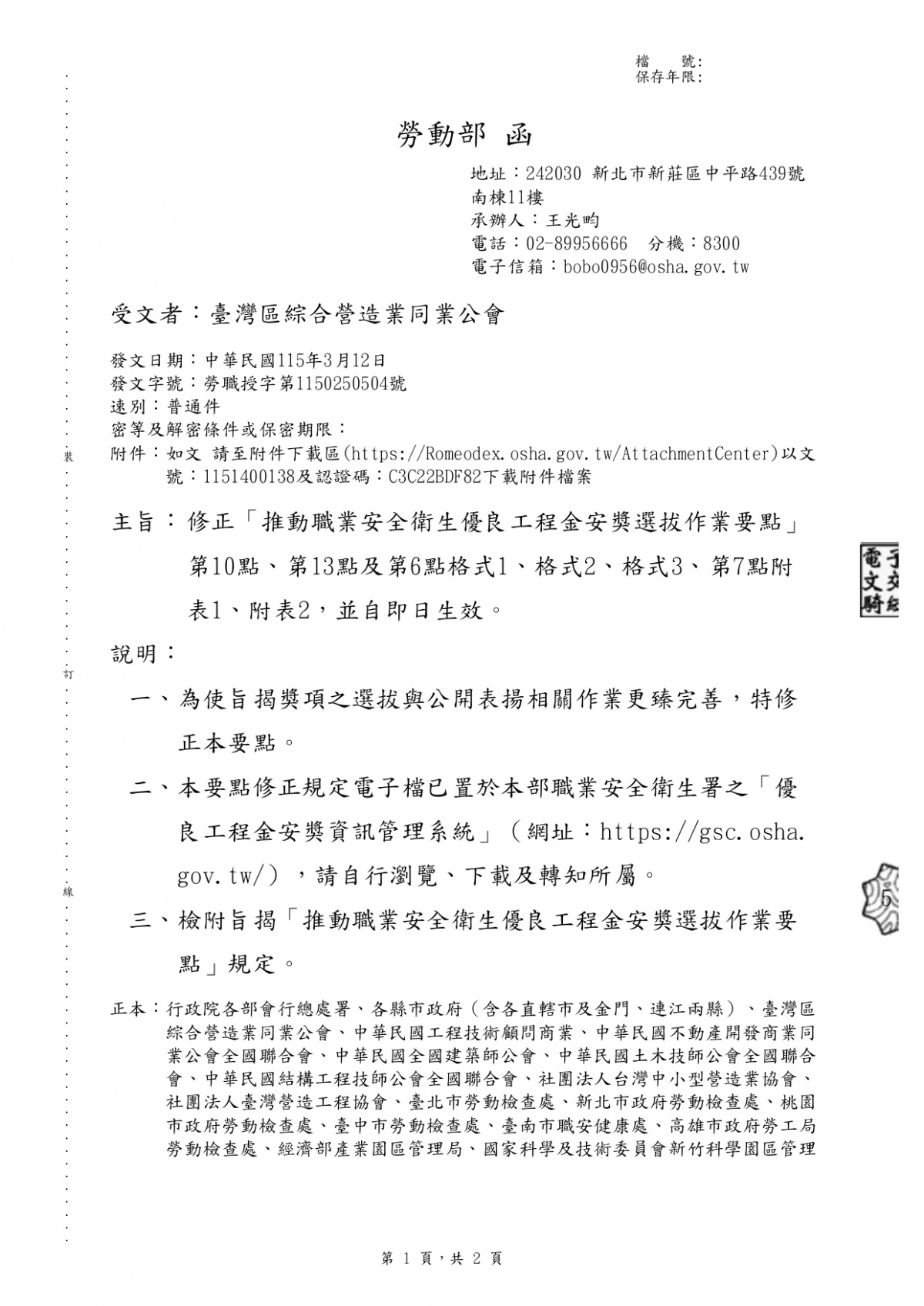 勞動部 修正「推動職業安全衛生優良工程金安獎選拔作業要點」第10點、第13點及第6點格式1、格式2、格式3、第7點附表1、附表2,並自即日生效 2026-03-16 檔案下載 勞動部 115.3.12 勞職授字第1150250504號函 修正「推動職業安全衛生優良工程金安獎選拔作業要點」第10點、第13點及第6點格式1、格式2、格式3、第7點附表1、附表2,並自即日生效。