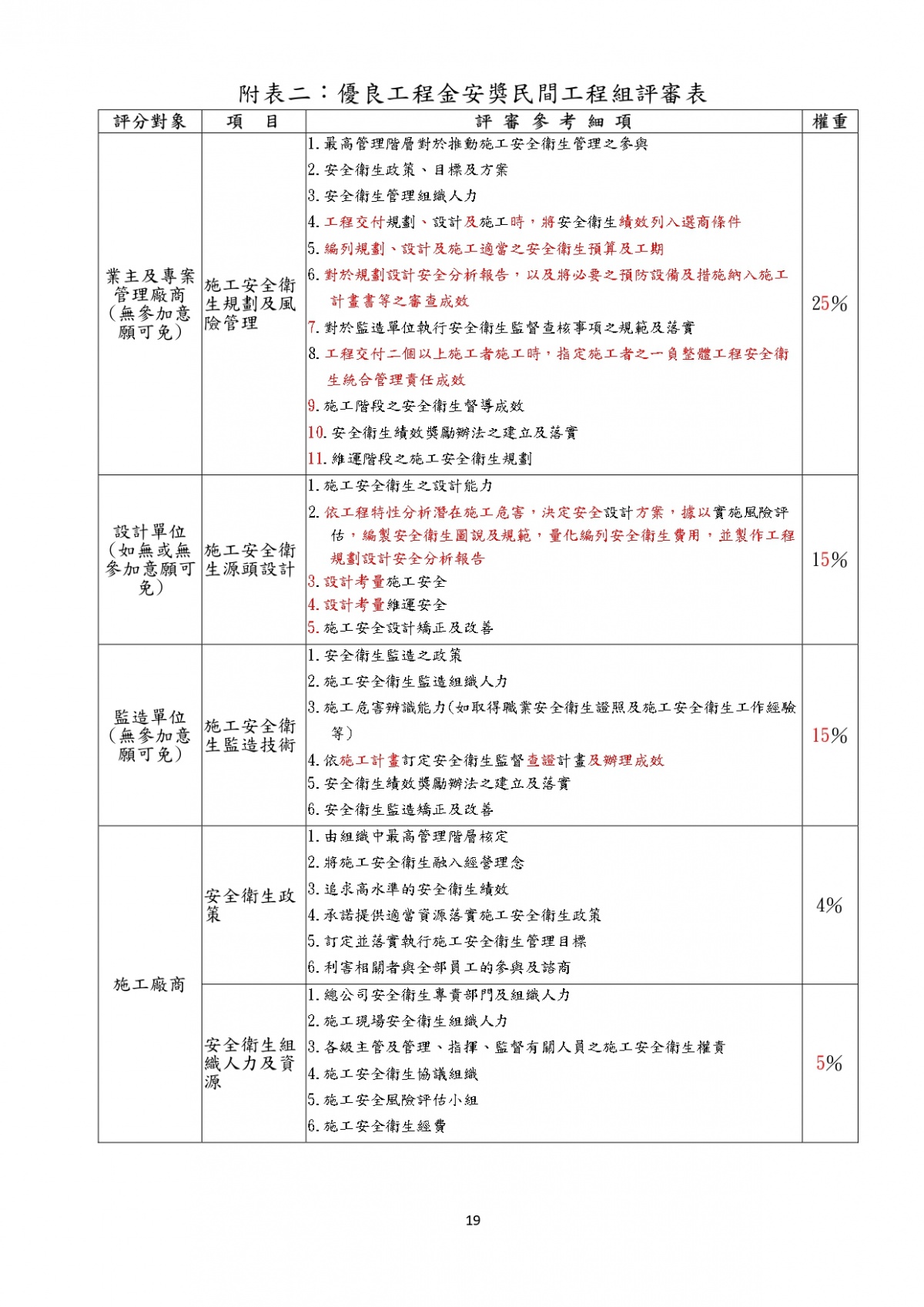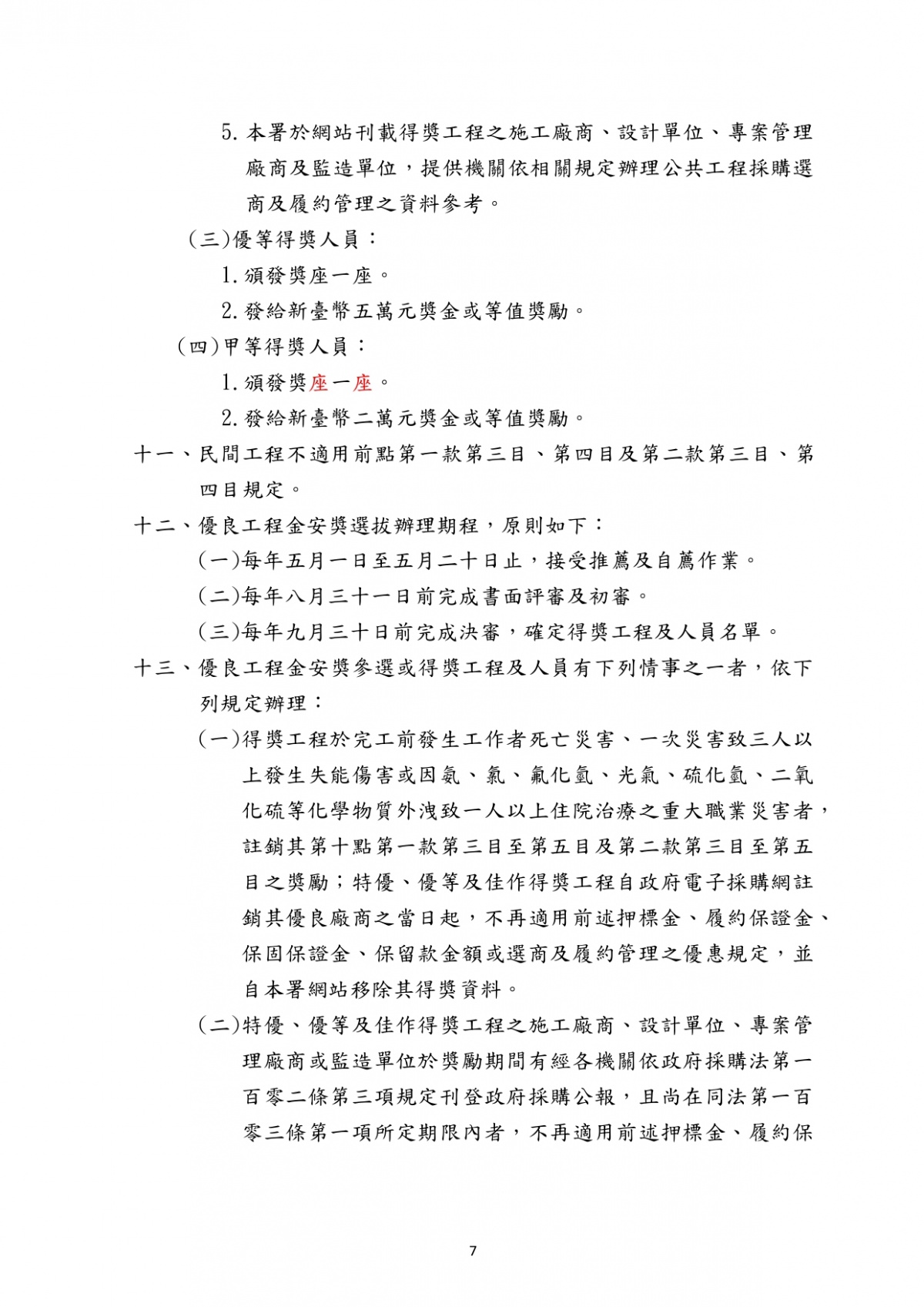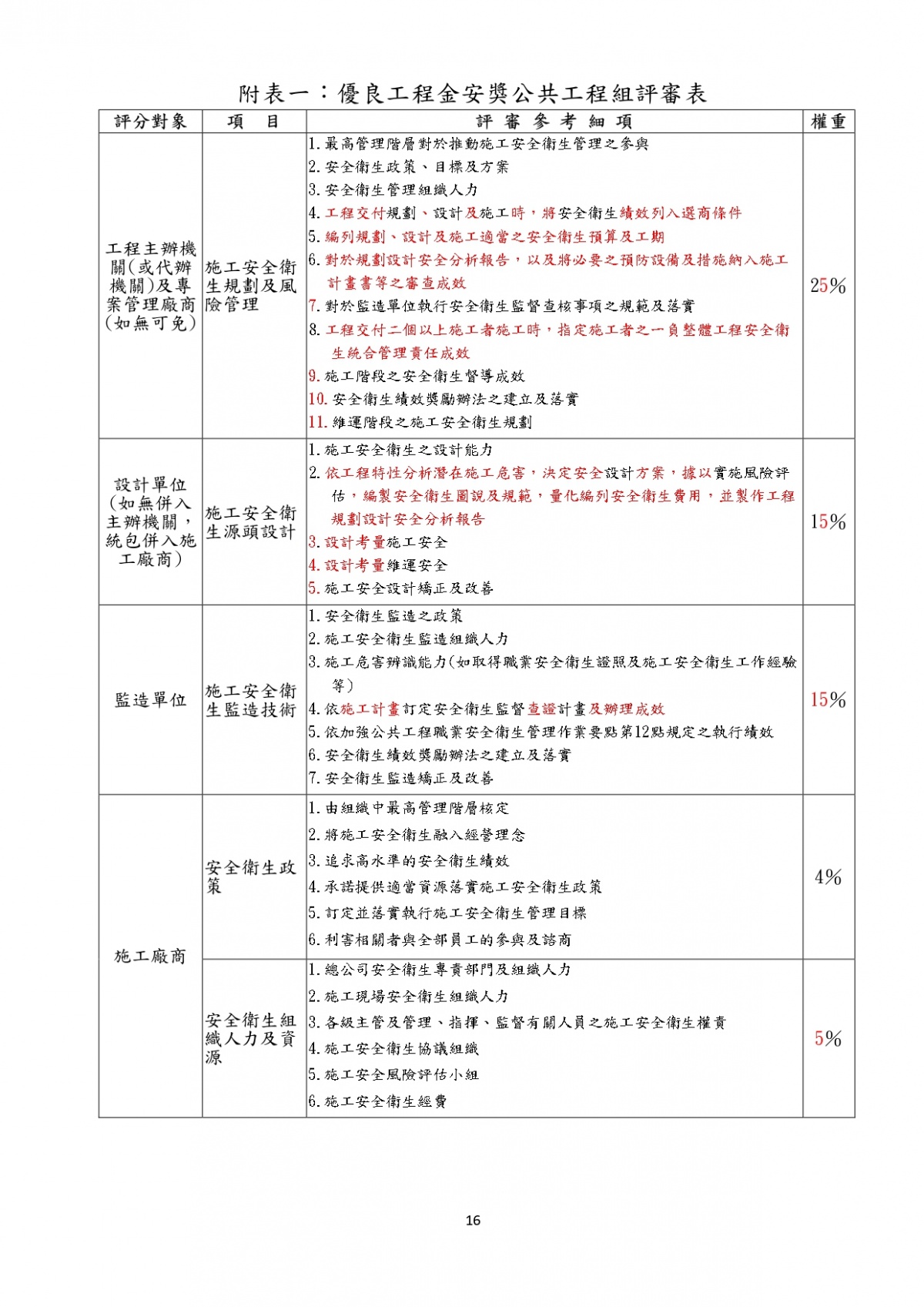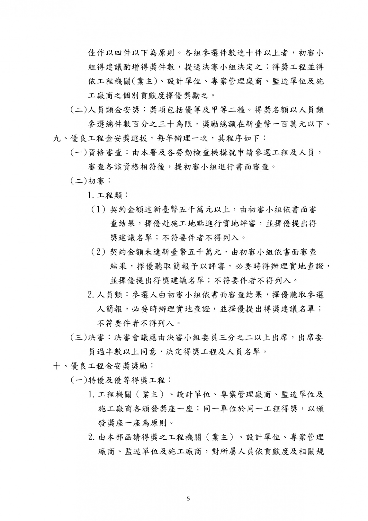 勞動部 修正「推動職業安全衛生優良工程金安獎選拔作業要點」第10點、第13點及第6點格式1、格式2、格式3、第7點附表1、附表2,並自即日生效 2026-03-16 檔案下載 勞動部 115.3.12 勞職授字第1150250504號函 修正「推動職業安全衛生優良工程金安獎選拔作業要點」第10點、第13點及第6點格式1、格式2、格式3、第7點附表1、附表2,並自即日生效。