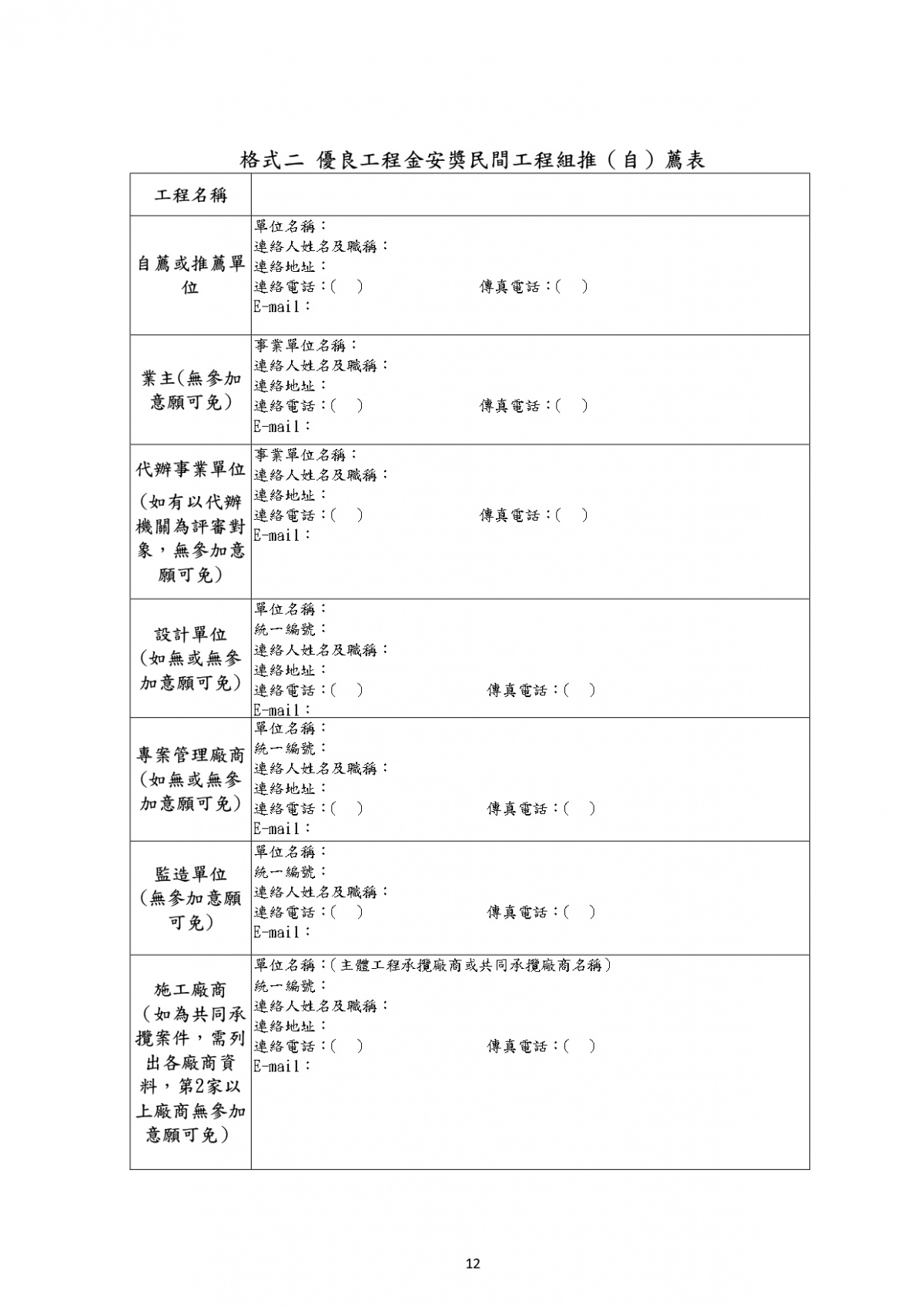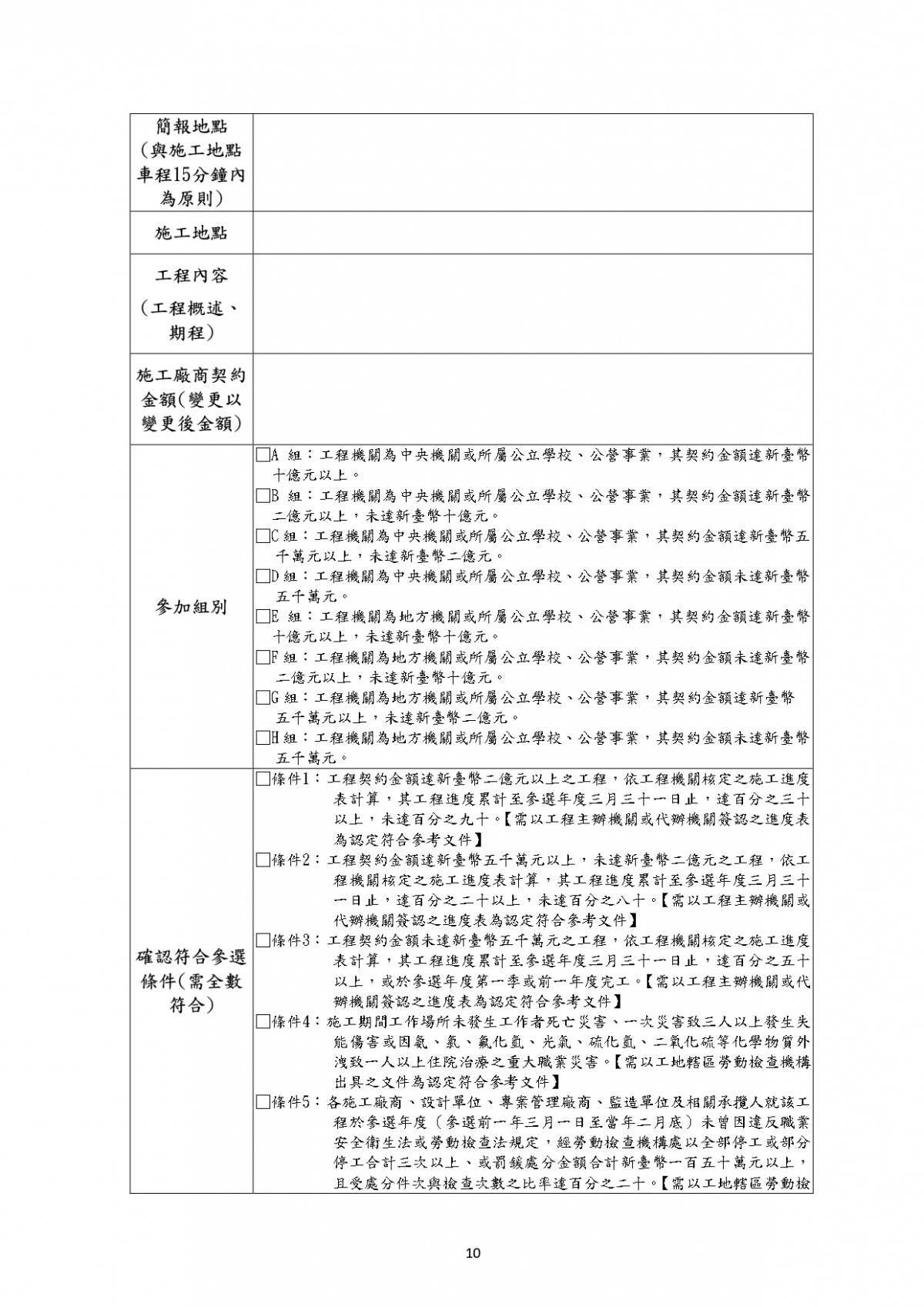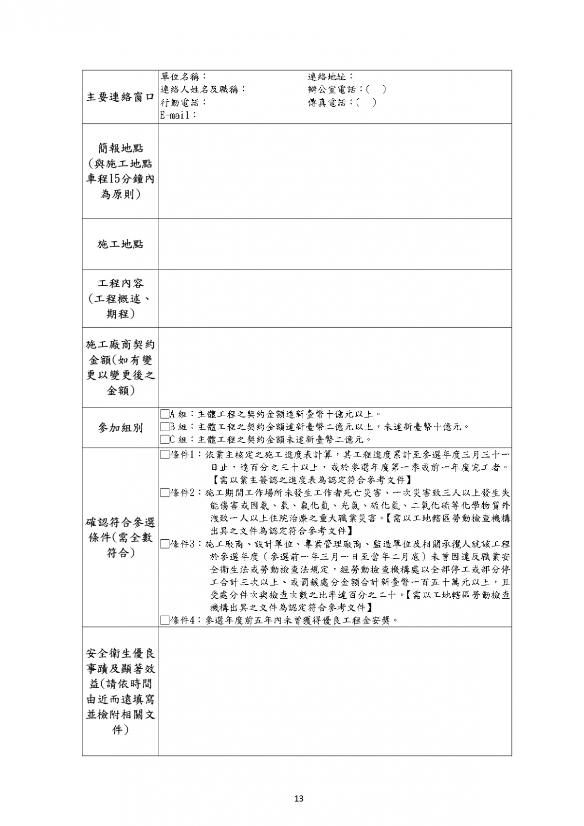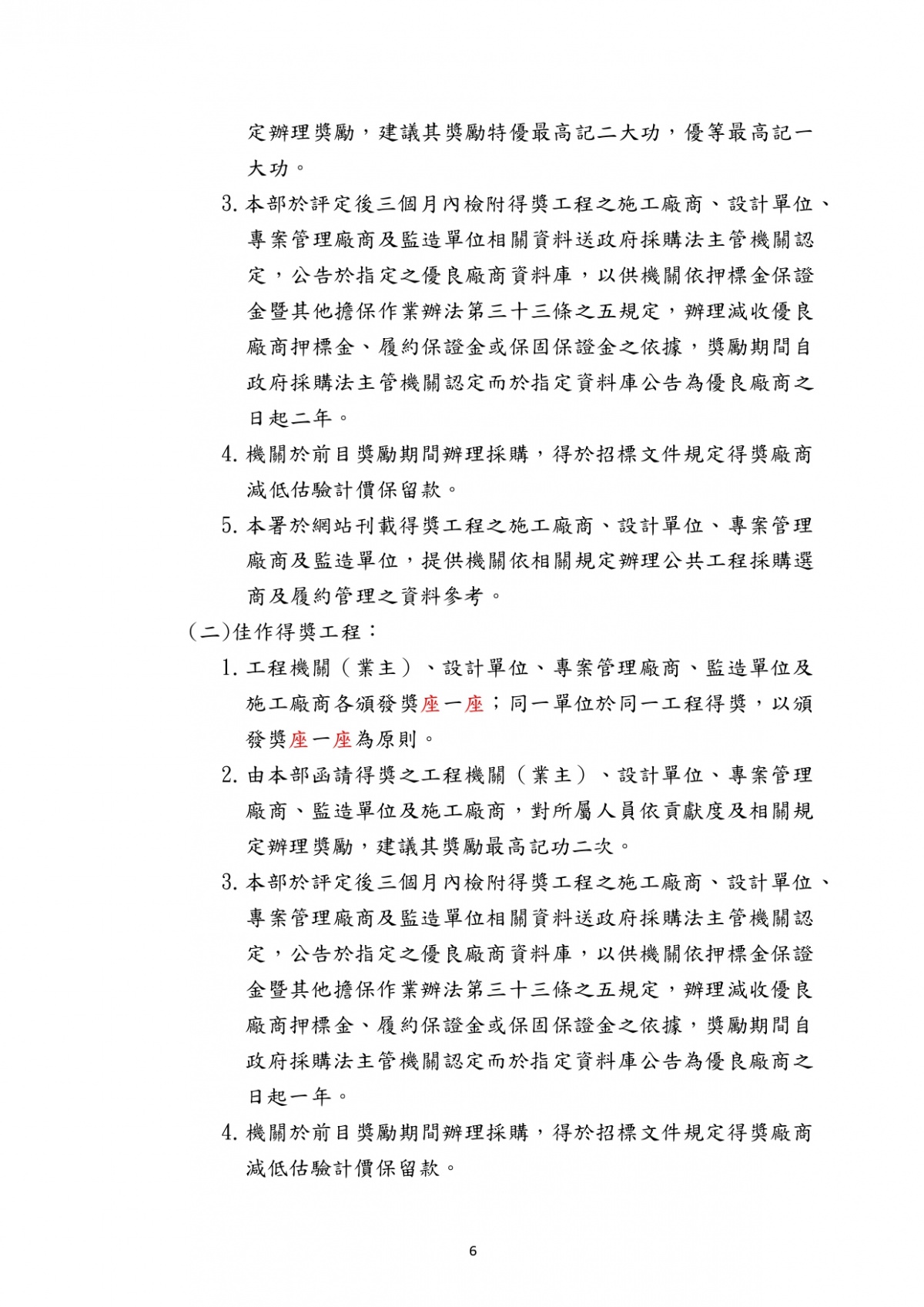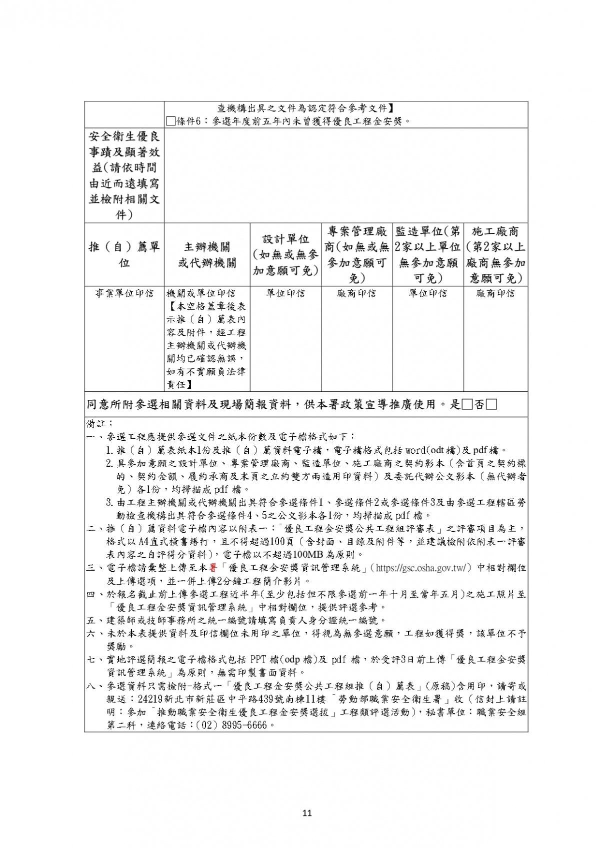 勞動部 修正「推動職業安全衛生優良工程金安獎選拔作業要點」第10點、第13點及第6點格式1、格式2、格式3、第7點附表1、附表2,並自即日生效 2026-03-16 檔案下載 勞動部 115.3.12 勞職授字第1150250504號函 修正「推動職業安全衛生優良工程金安獎選拔作業要點」第10點、第13點及第6點格式1、格式2、格式3、第7點附表1、附表2,並自即日生效。