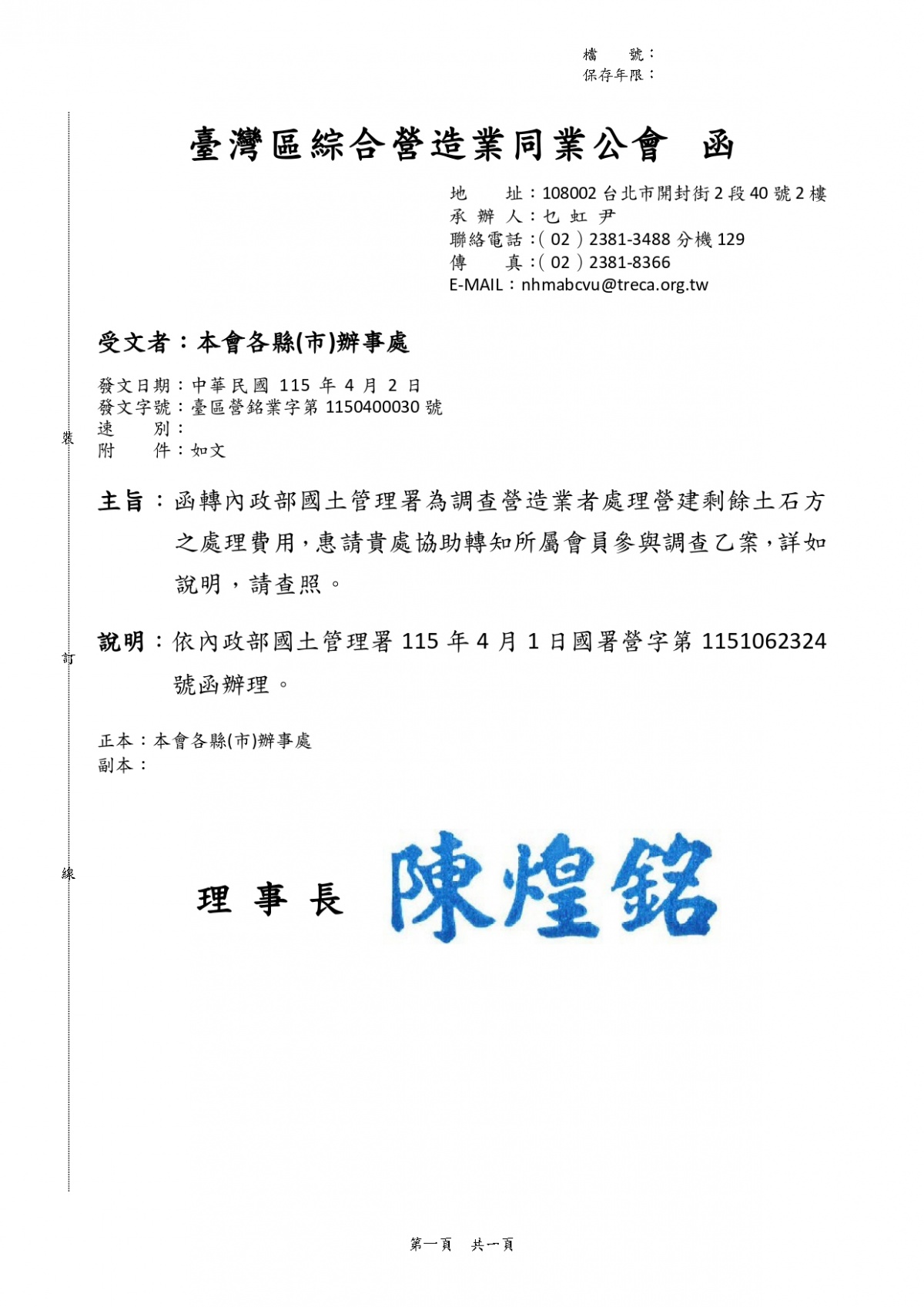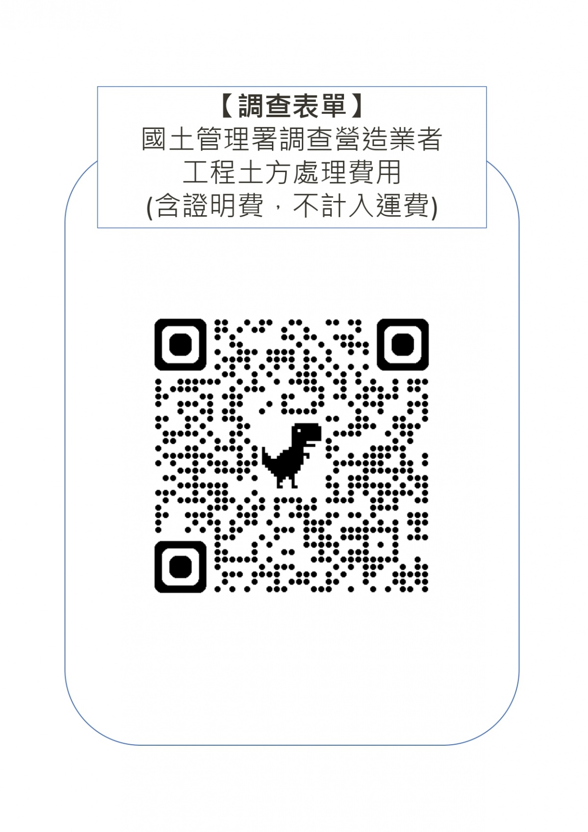 國土管理署「調查營造業者承攬工程產出營建剩餘土石方之處理費用」 2026-04-07 檔案下載 國土管理署 國署營字第1151062324號 調查營造業者承攬工程產出營建剩餘土石方之處理費用,請儘速 協助轉知所屬會員至線上問卷平台 (網址:https://tally.so/r/68Ra7Y)填報,或 掃QR CODE問卷連結填報。 本問卷填寫注意事項: (一)調查資料將採去識別化方式辦理,所蒐集之數據僅供餘土管理政策研議參考。 (二)請填寫工程餘土處理費用及證明文件費用(扣除運輸費用)之單價,以利數據統計。