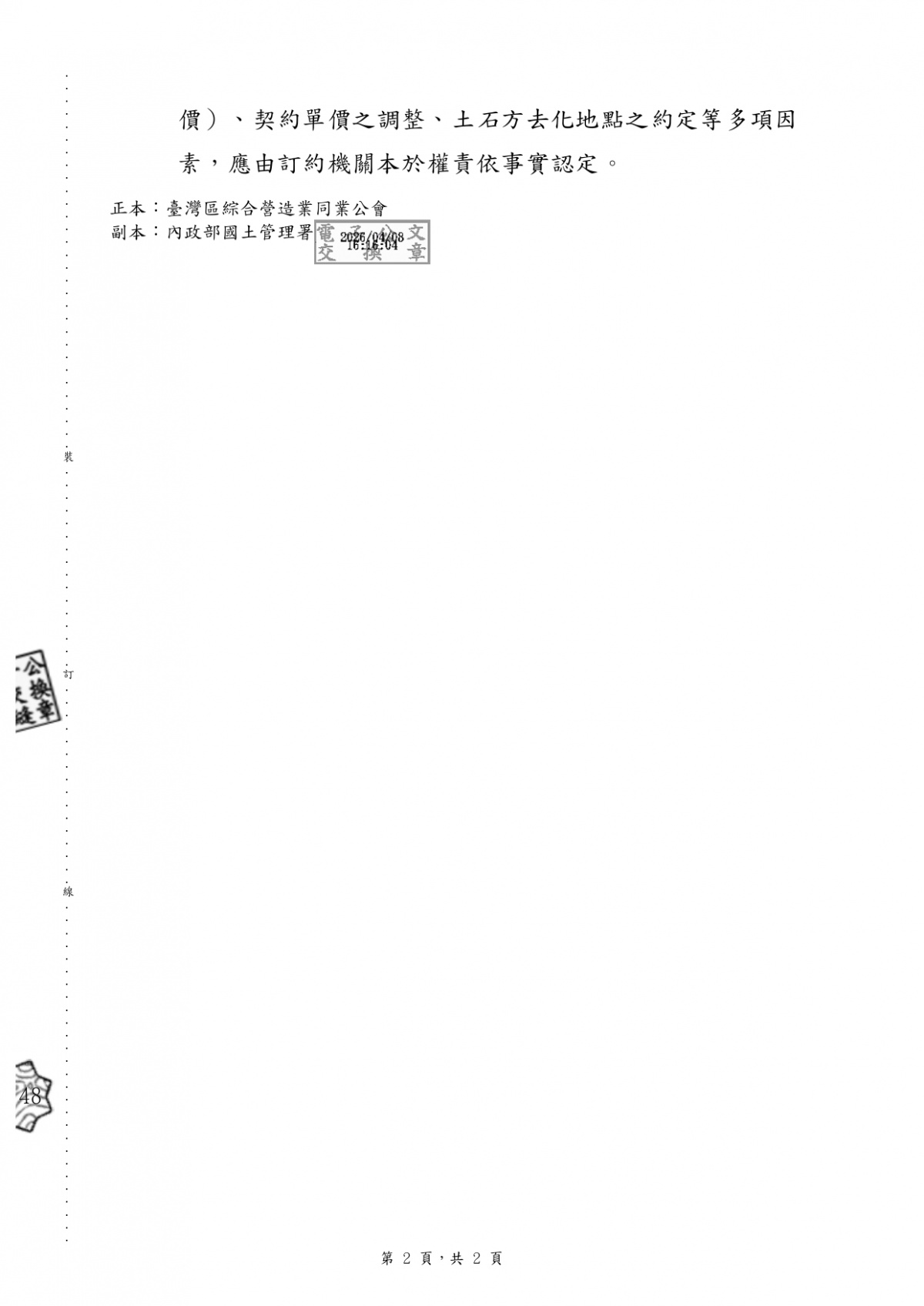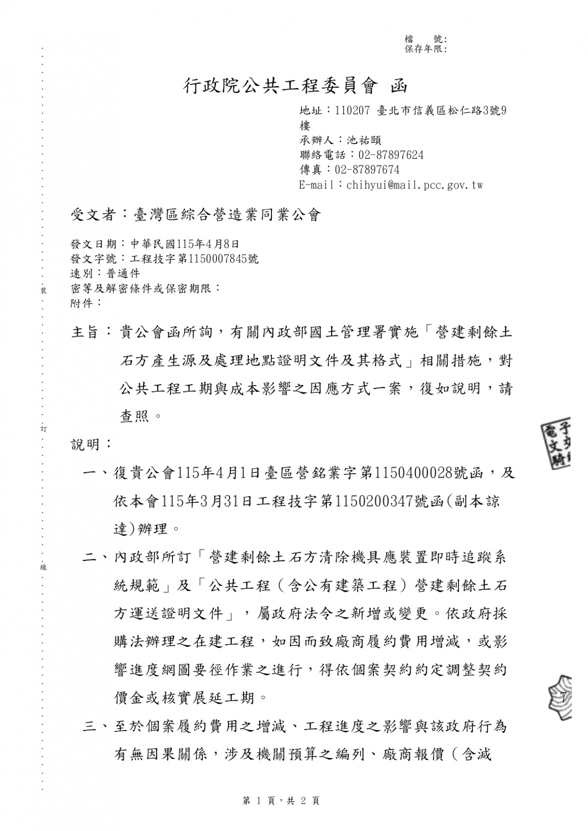 行政院公共工程委員會 有關內政部國土管理署實施「營建剩餘土石方產生源及處理地點證明文件及其格式」相關措施因應方式一案 2026-04-13 檔案下載 行政院公共工程委員會 115.4.8 工程技字第1150007845號函 有關本會函所詢,有關內政部國土管理署實施「營建剩餘土石方產生源及處理地點證明文件及其格式」相關措施,對公共工程工期與成本影響之因應方式一案,復如說明。