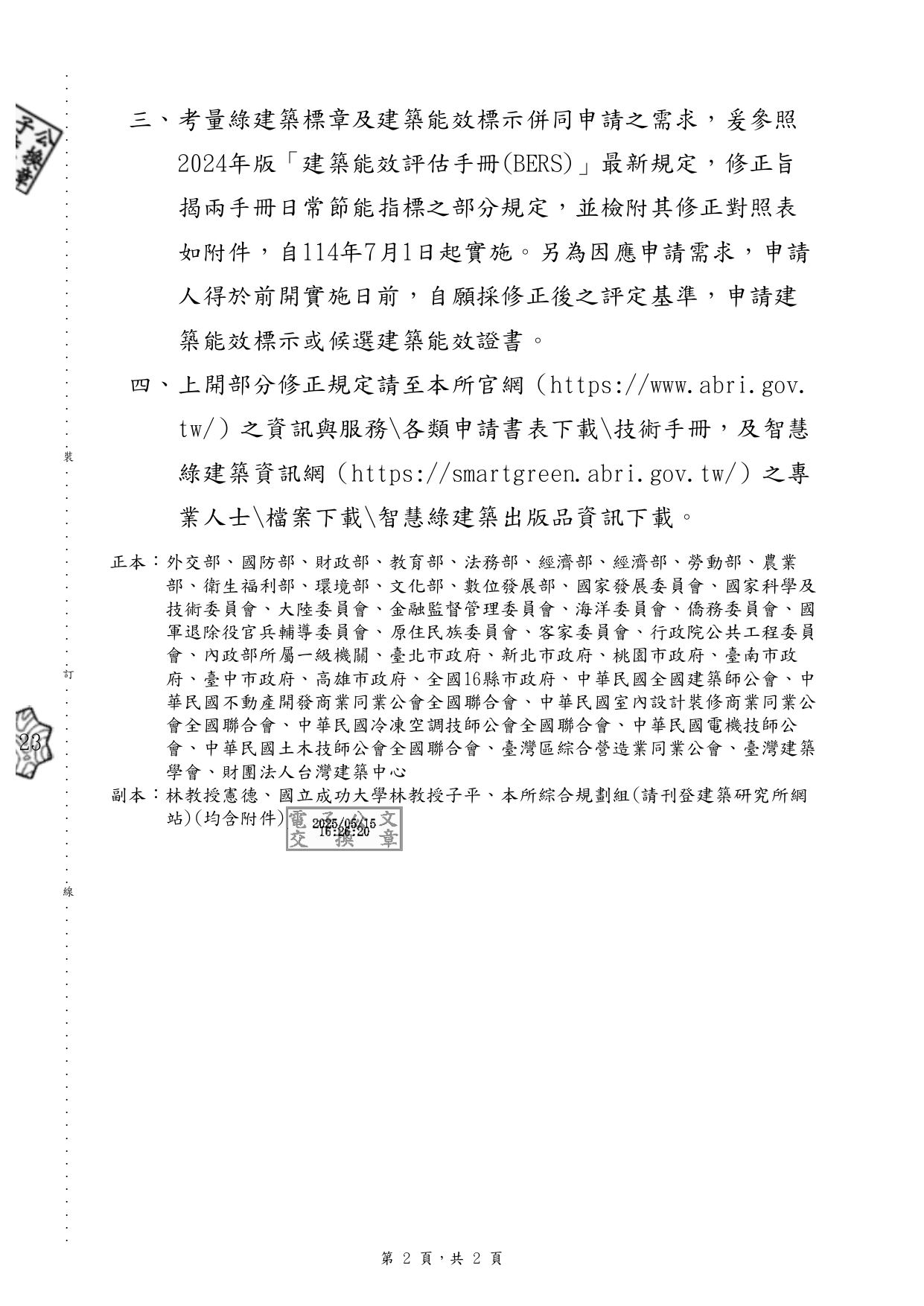 內政部建築研究所2023年版「綠建築評估手冊-基本型」及「綠建築評估手冊-住宿類」之日常節能指標部分規定修正如說明三,自中華民國一百十四年七月一日實施。