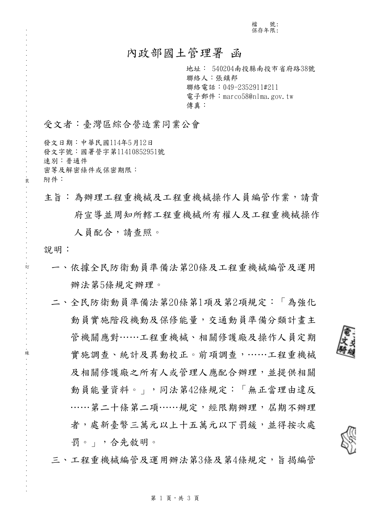內政部國土管理署 114.5.12 國署營字第11410852951號函