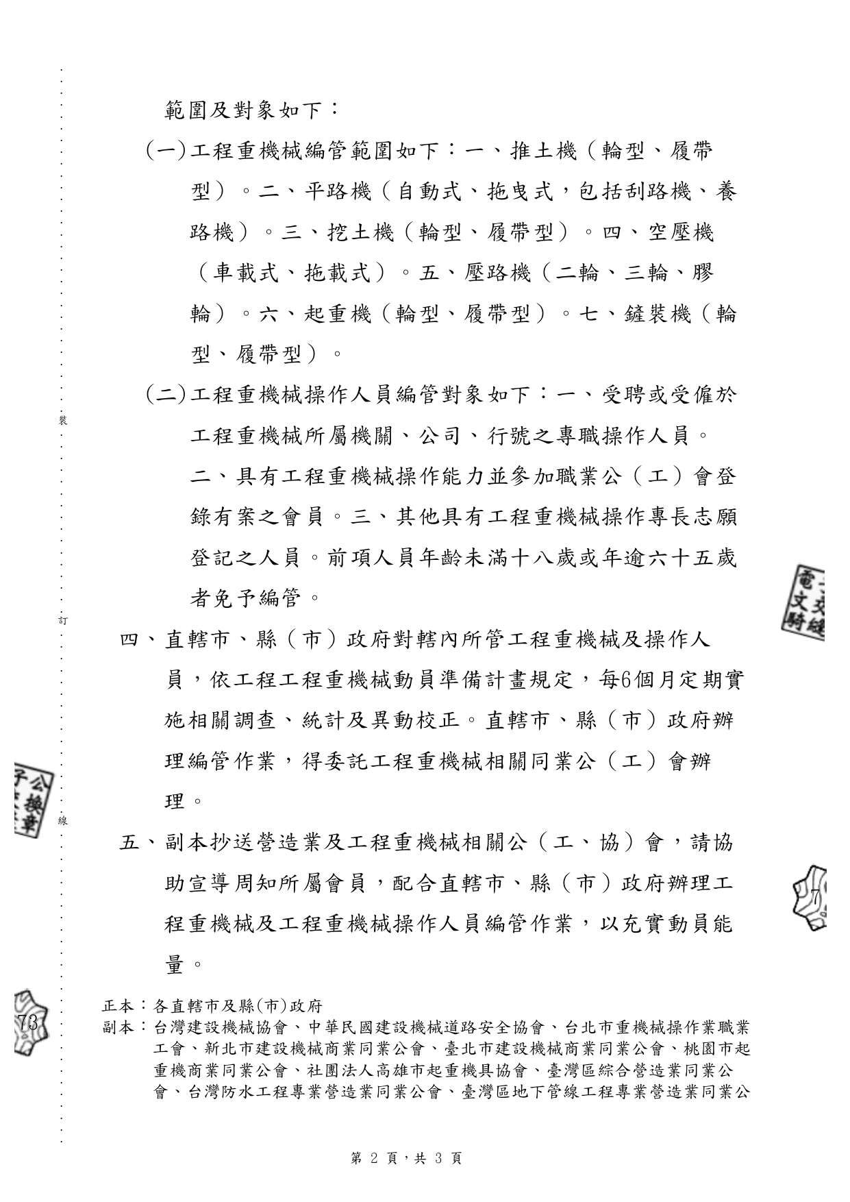 為辦理工程重機械及工程重機械操作人員編管作業,副本抄送營造業及工程重機械相關公(工、協)會,請協助宣導周知轄區會員,配合直轄市、縣(市)政府辦理工程重機械及工程重機械操作人員編管作業,以充實動員能量。