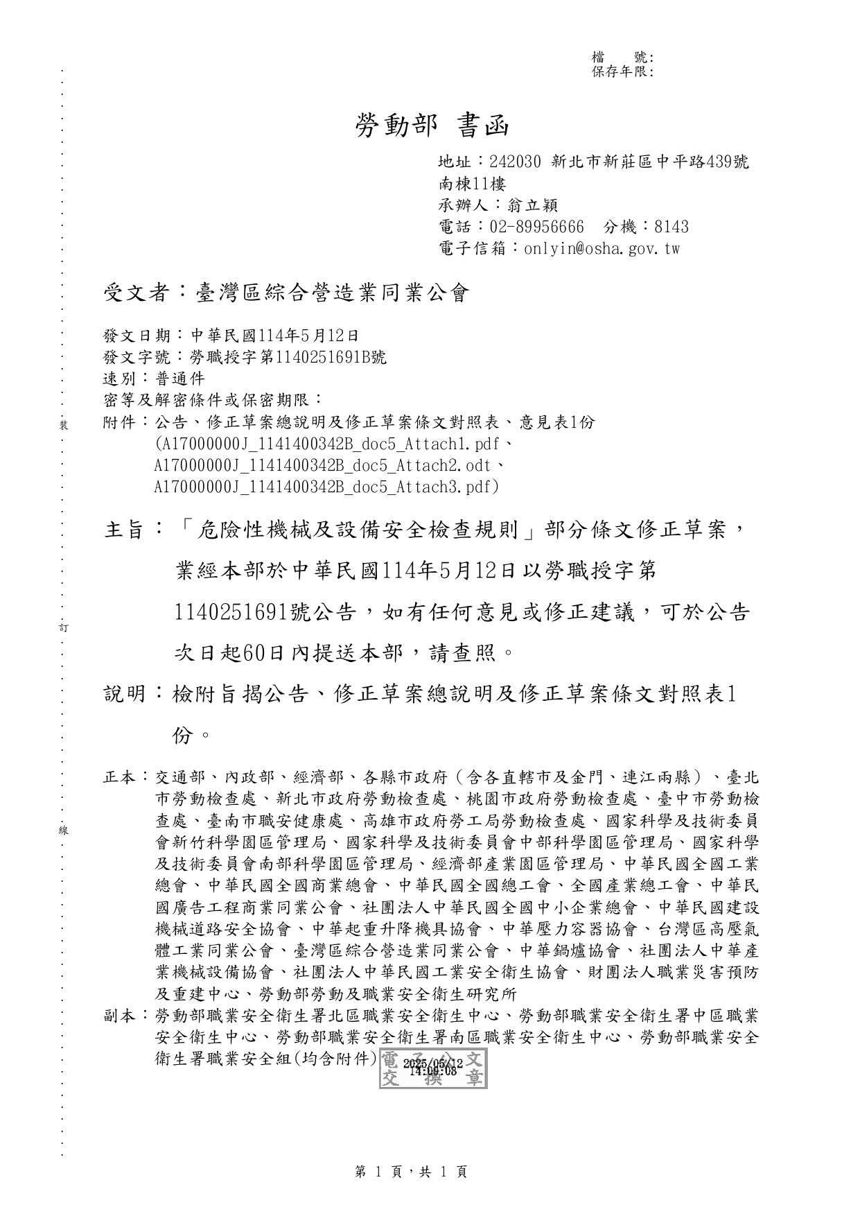 有關「危險性機械及設備安全檢查規則」部分條文修正草案,業經勞動部於中華民國114年5月12日以勞職授字第1140251691號公告,如有任何意見或修正建議,可於公告次日起60日內提送 勞動部。