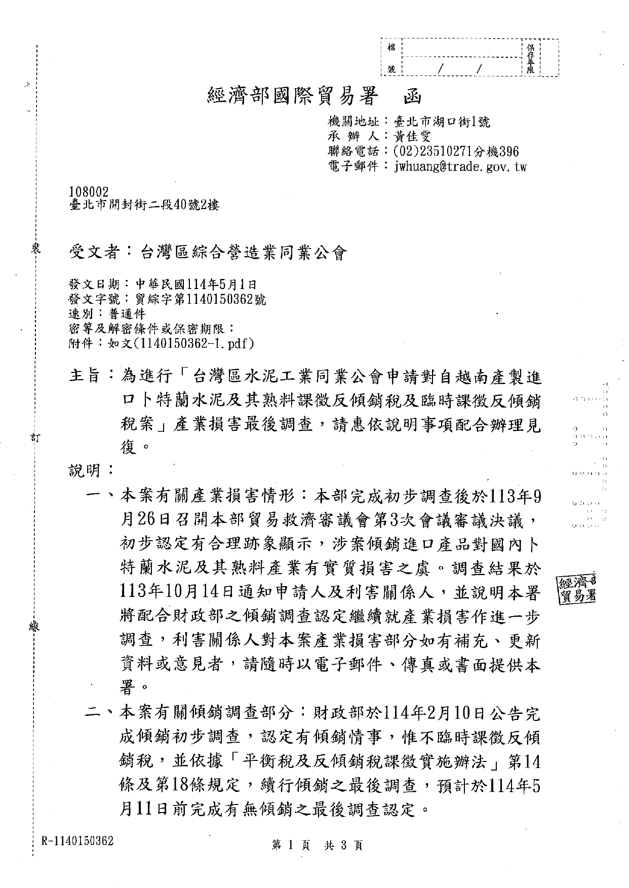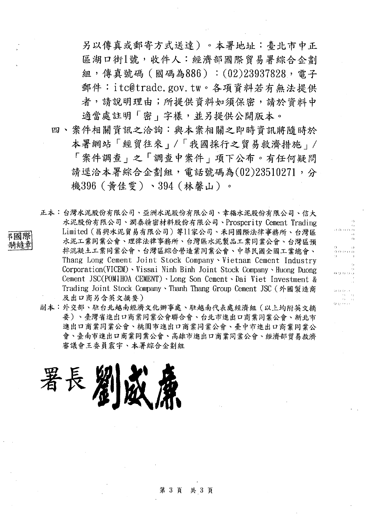 經濟部國際貿易署『為進行「台灣區水泥工業同業公會申請對自越南產製進口卜特蘭水泥及其熟料課徵反傾銷稅及臨時課徵反傾銷稅案」產業損害最終調查』