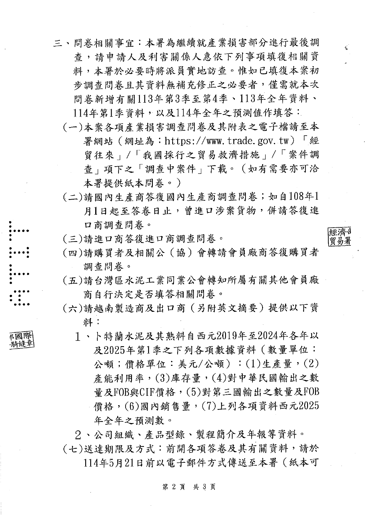 有關『為進行「台灣區水泥工業同業公會申請對自越南產製進口卜特蘭水泥及其熟料課徵反傾銷稅及臨時課徵反傾銷稅案」產業損害最終調查』,請惠依說明事項辦理見復。