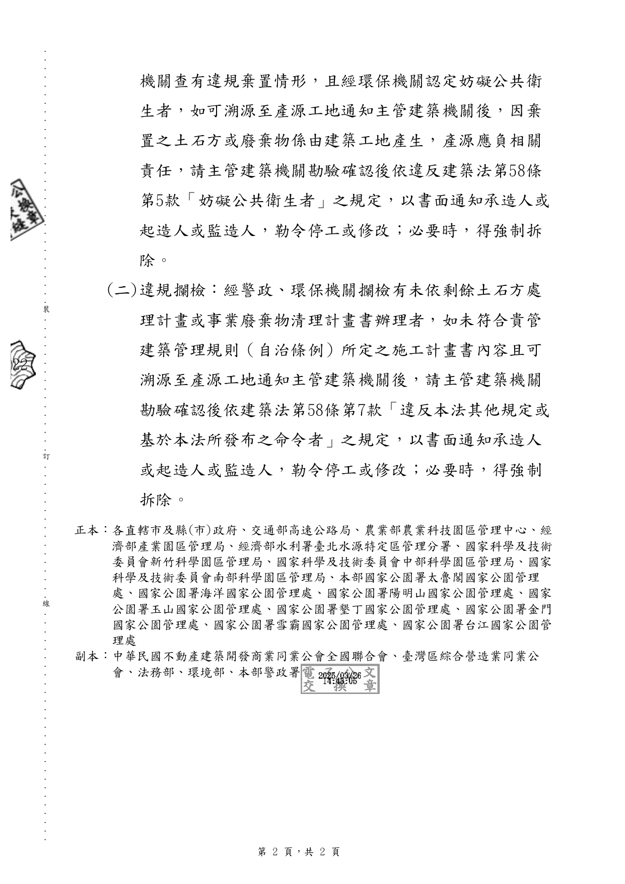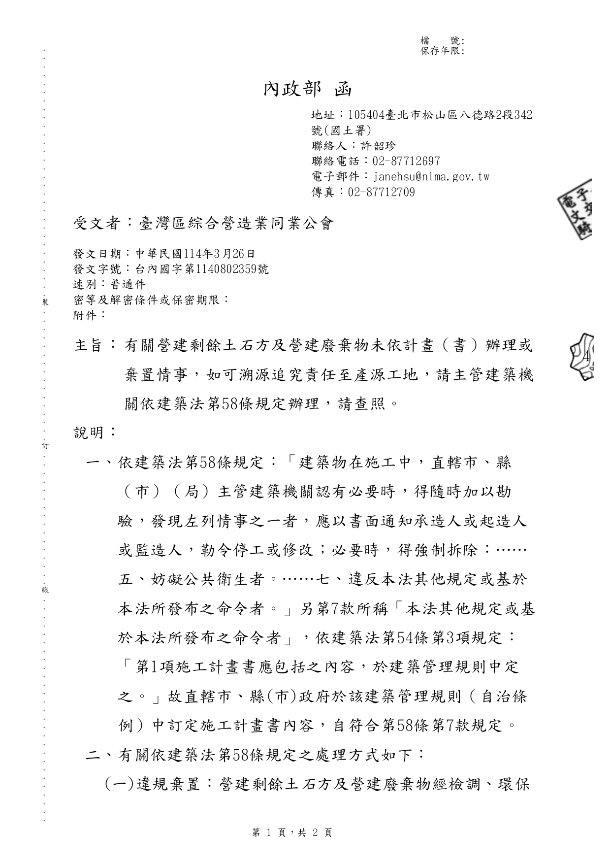 內政部-有關營建剩餘土石方及營建廢棄物未依計畫(書)辦理或棄置情事,如可溯源追究責任至產源工地