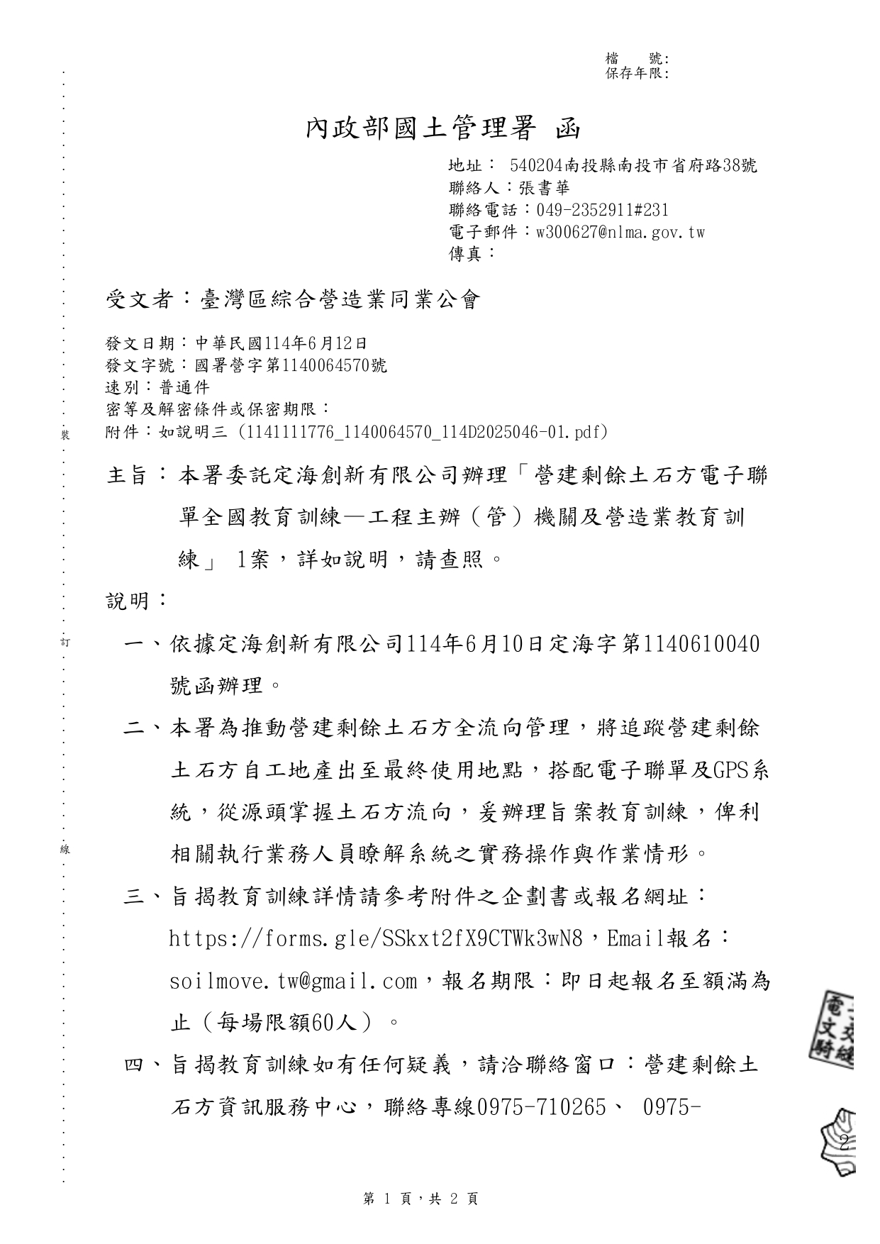 內政部國土管理署 114.6.12 國署營字第1140064570號函