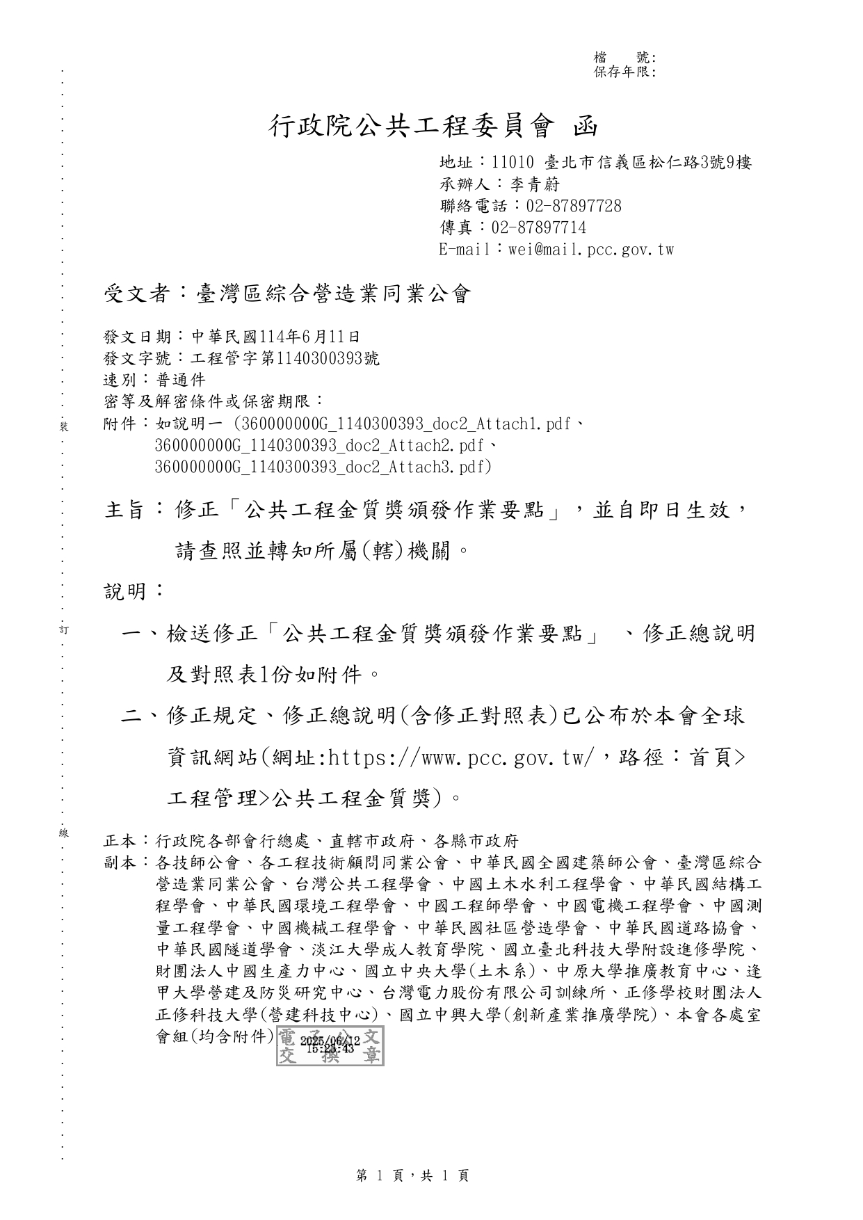 行政院公共工程委員會 114.6.11 工程管字第1140300393號函