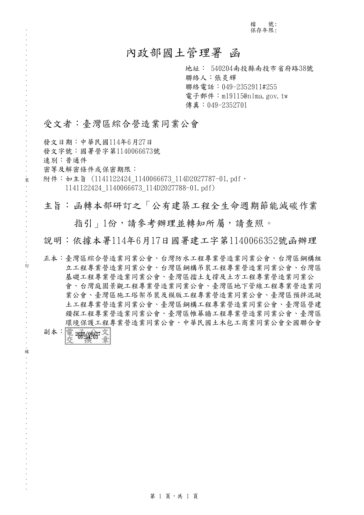 內政部國土管理署 114.6.27 國署營字第1140066673號函