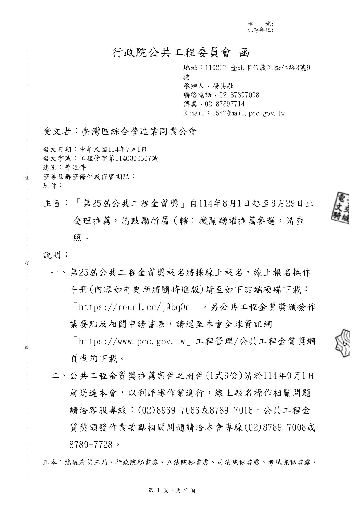 3.公共工程金質獎推薦案件之附件(1式6份)請於114年9月1日前送達行政院公共工程委員會