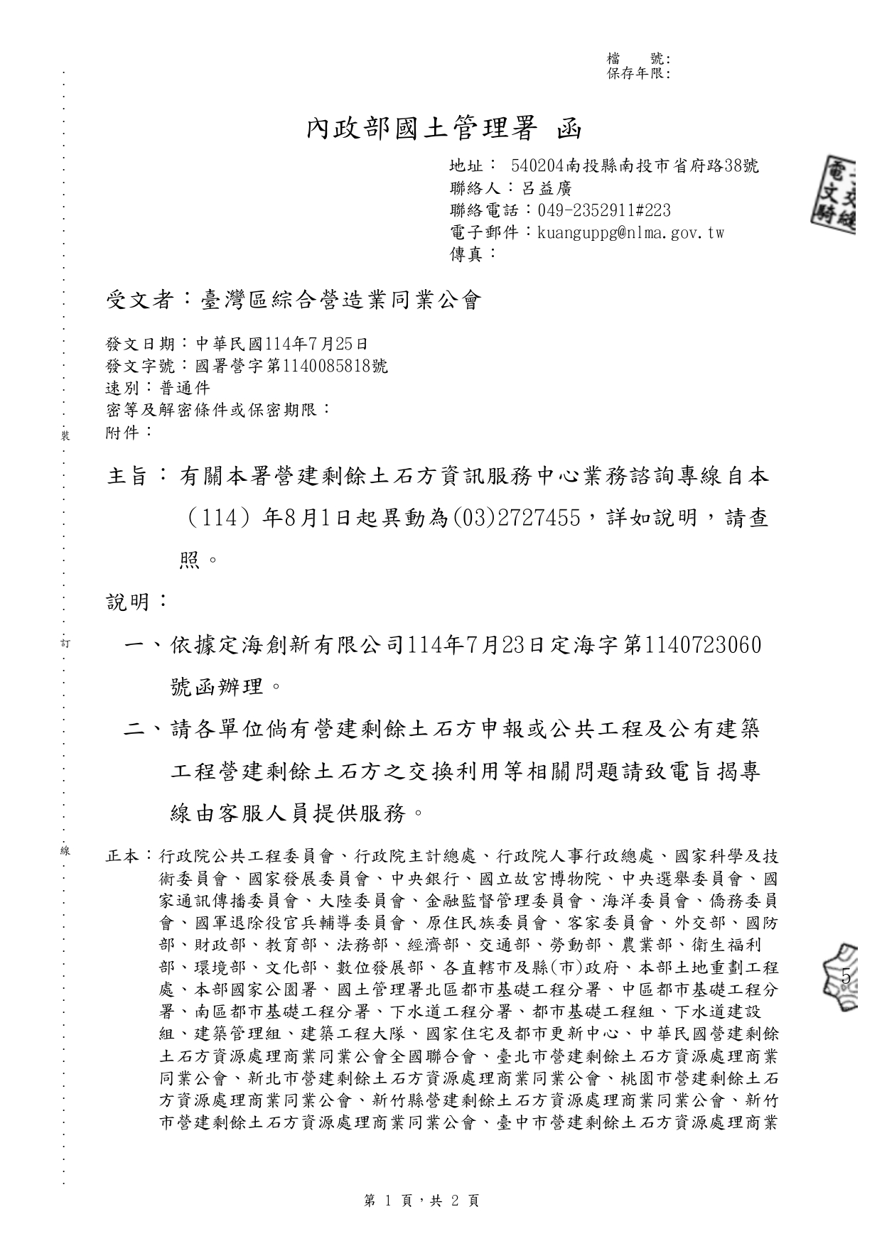 有關內政部國土管理署營建剩餘土石方資訊服務中心業務諮詢專線自本(114)年8月1日起異動為(03)2727455,詳如說明