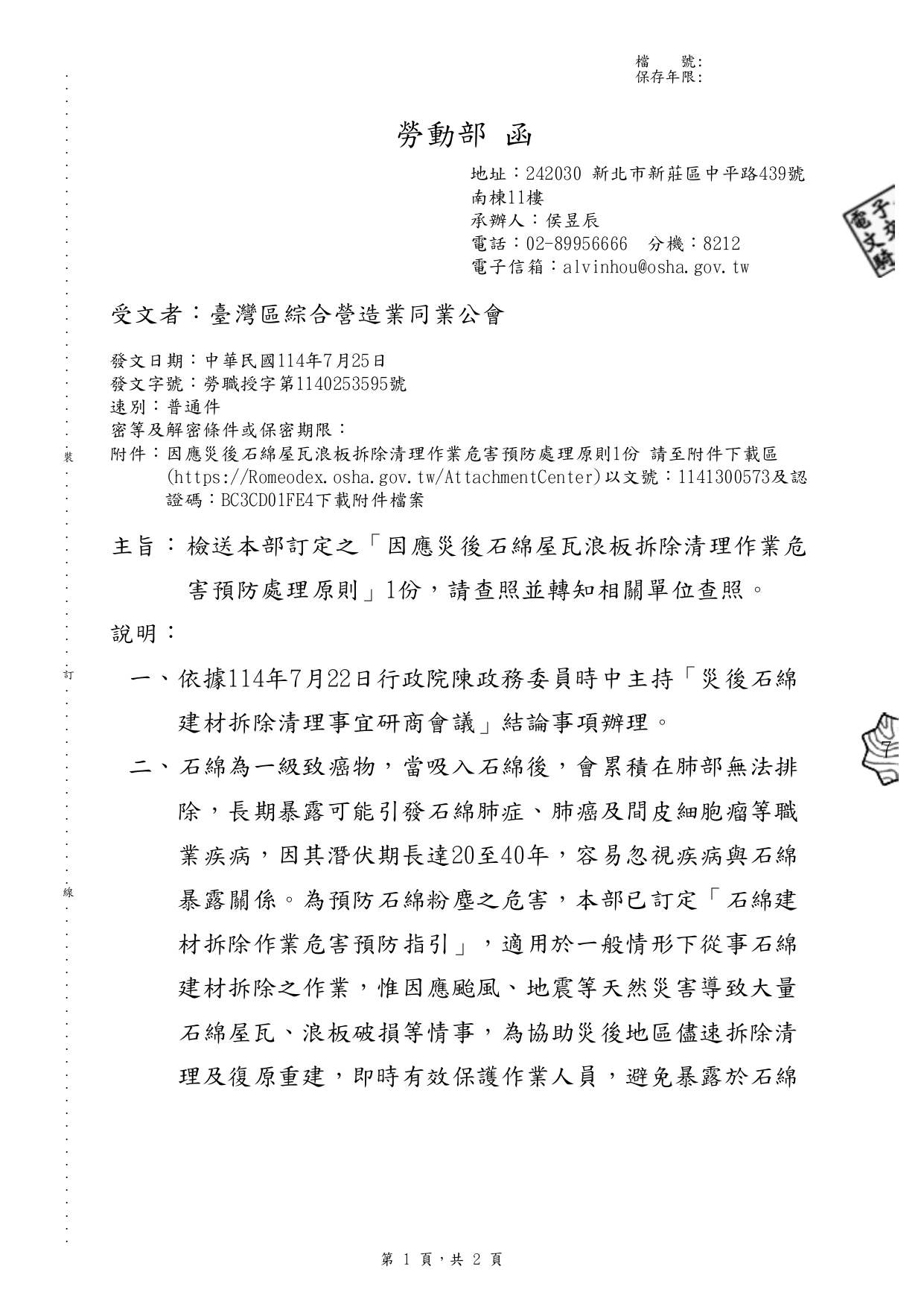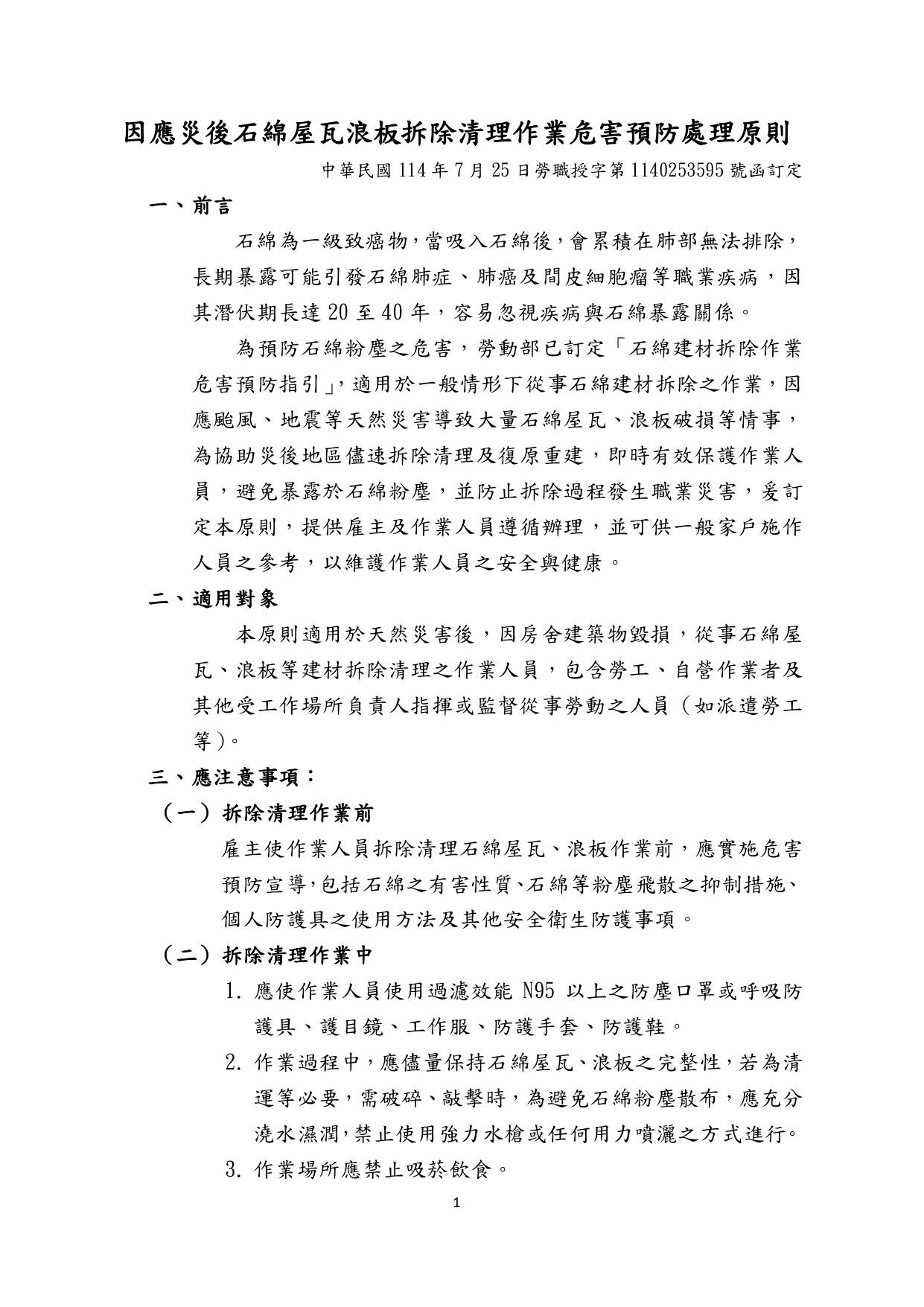 勞動部訂定之「因應災後石綿屋瓦浪板拆除清理作業危害預防處理原則」1份