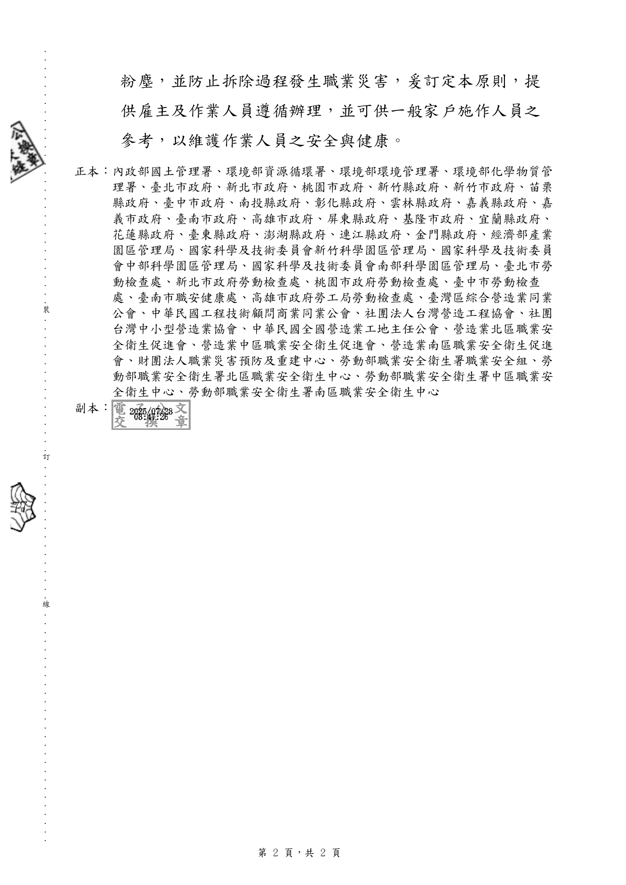 檢送勞動部訂定之「因應災後石綿屋瓦浪板拆除清理作業危害預防處理原則」1份