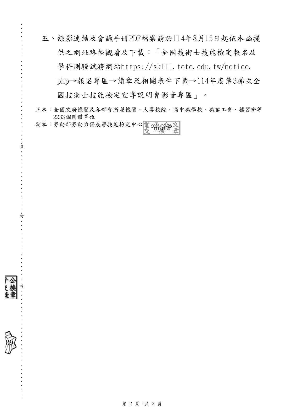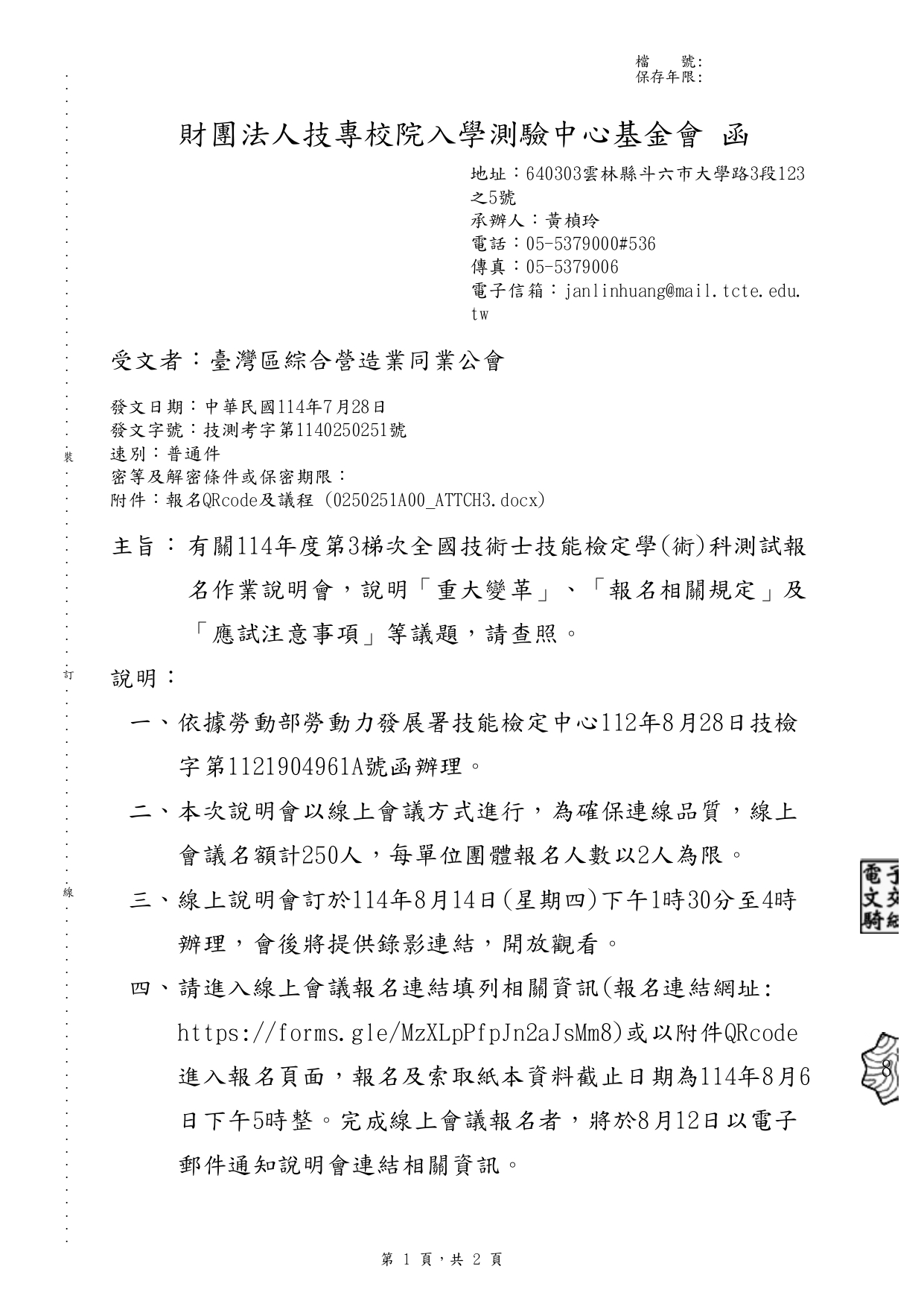 財團法人技專校院入學測驗中心基金會114.7.28 技測考字第1140250251號函