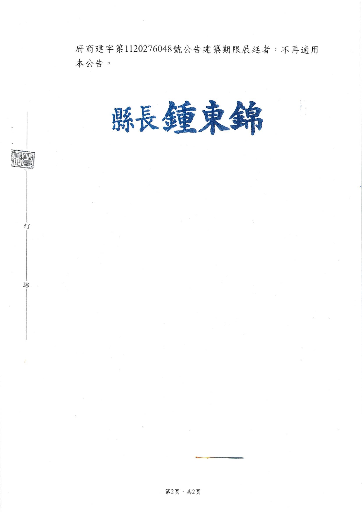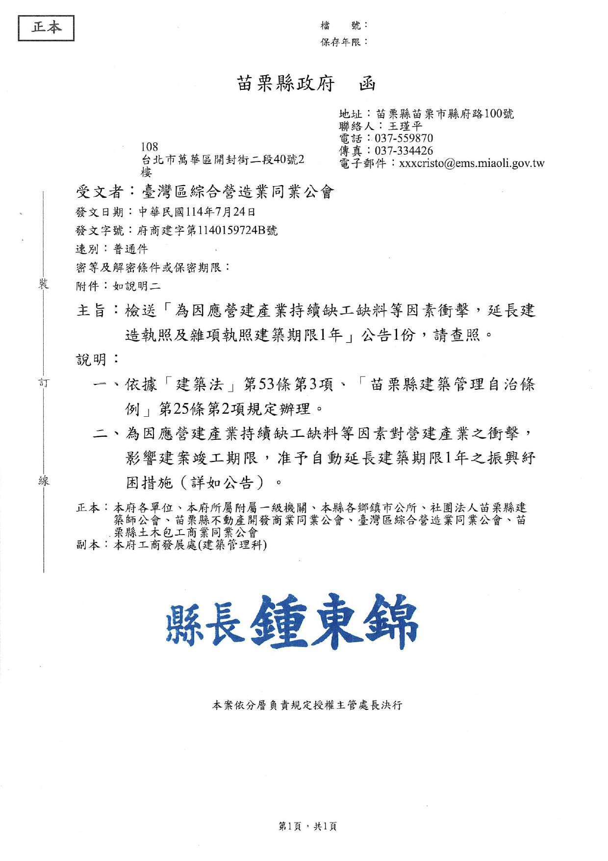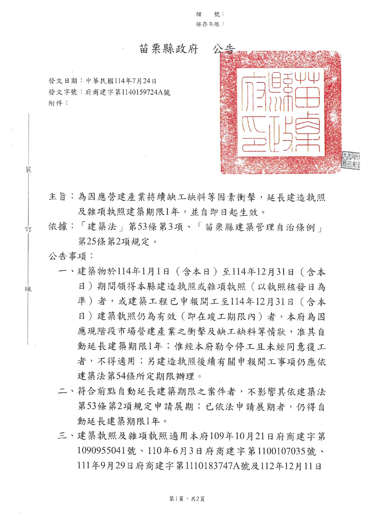 苗栗縣政府「為因應營建產業持續缺工缺料等因素衝繫,延長建造執照及雜項執照建築期限1年」公告1份