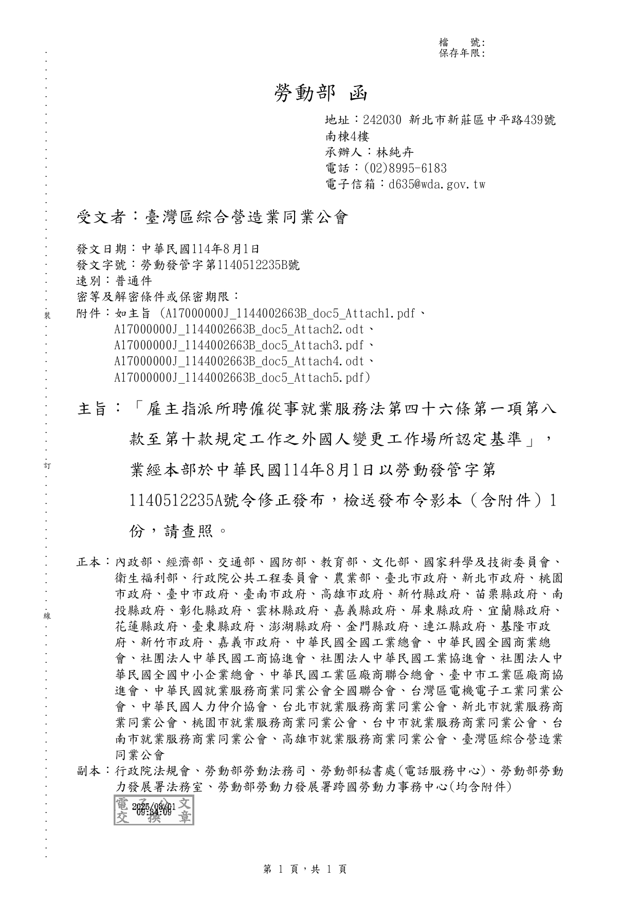 勞動部 114.8.1 勞動發管字第1140512235B號函