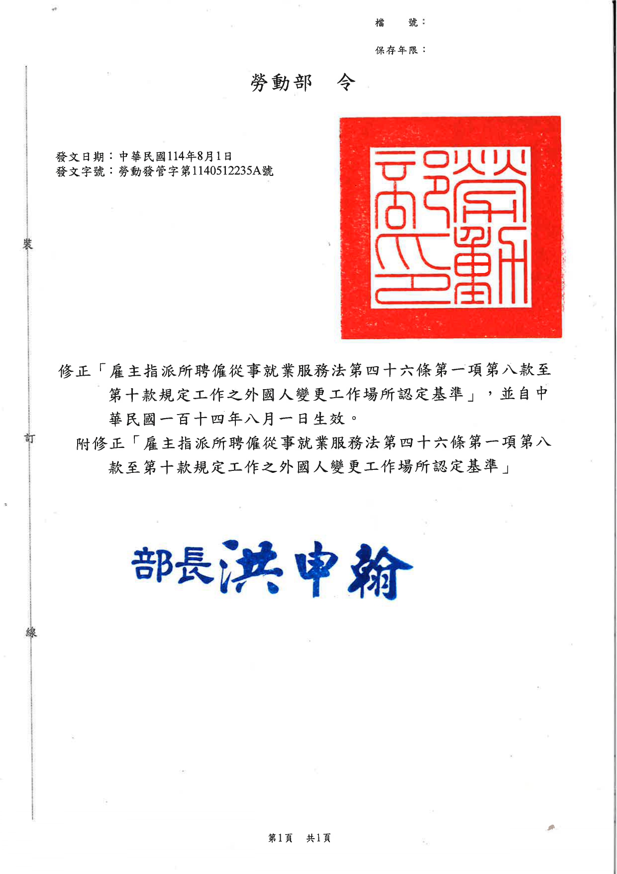 有關「雇主指派所聘僱從事就業服務法第四十六條第一項第八款至第十款規定工作之外國人變更工作場所認定基準」,業經勞動部於中華民國114年8月1日以勞動發管字第1140512235A號令修正發布,檢送發布令影本1份