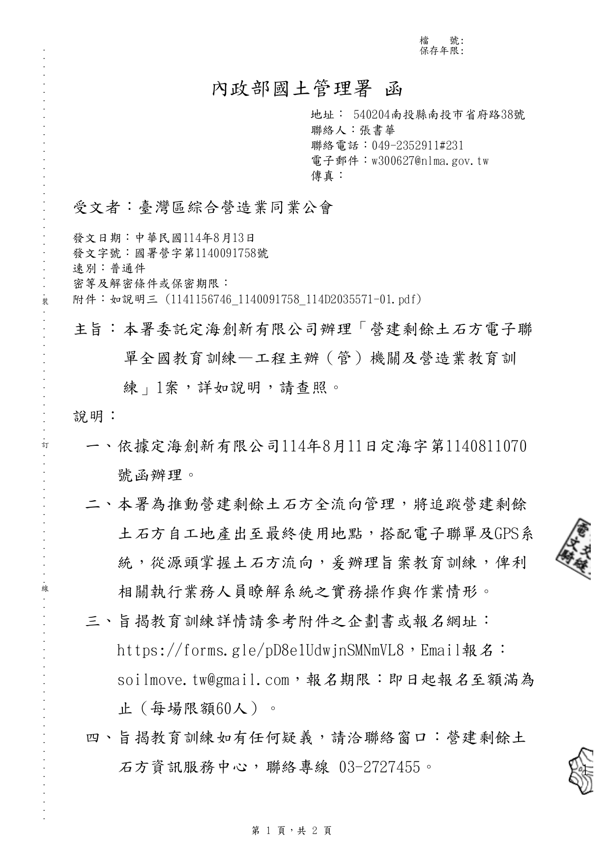 內政部國土管理署 114.8.13 國署營字第1140091758號函