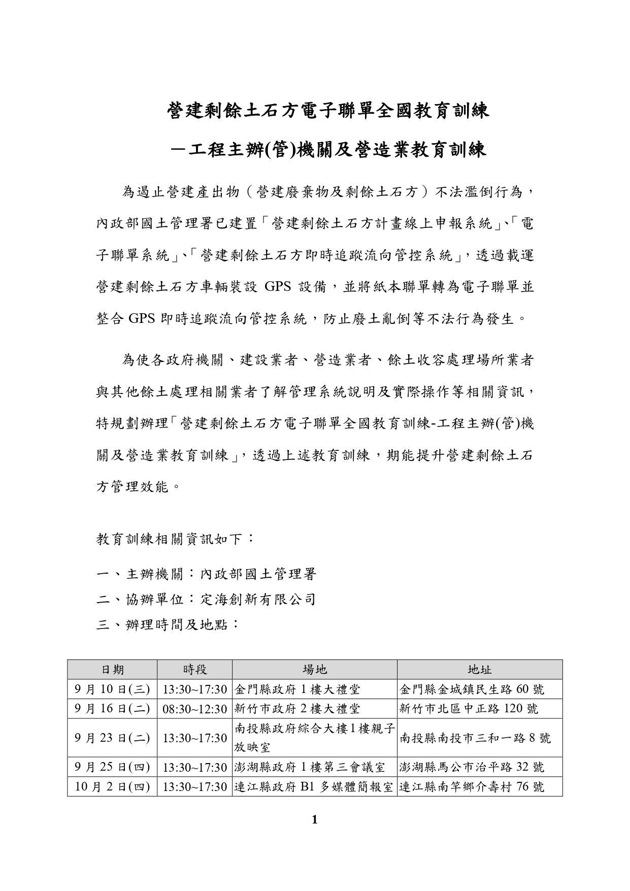 國土署委託定海創新有限公司辦理「營建剩餘土石方電子聯單全國教育訓練—工程主辦(管)機關及營造業教育訓練」1案