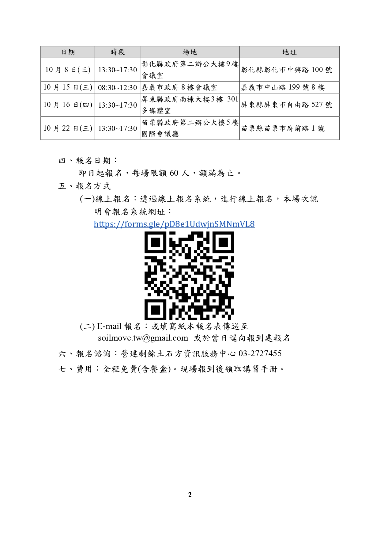 報名日期:即日起報名,每場限額60人,額滿為止。