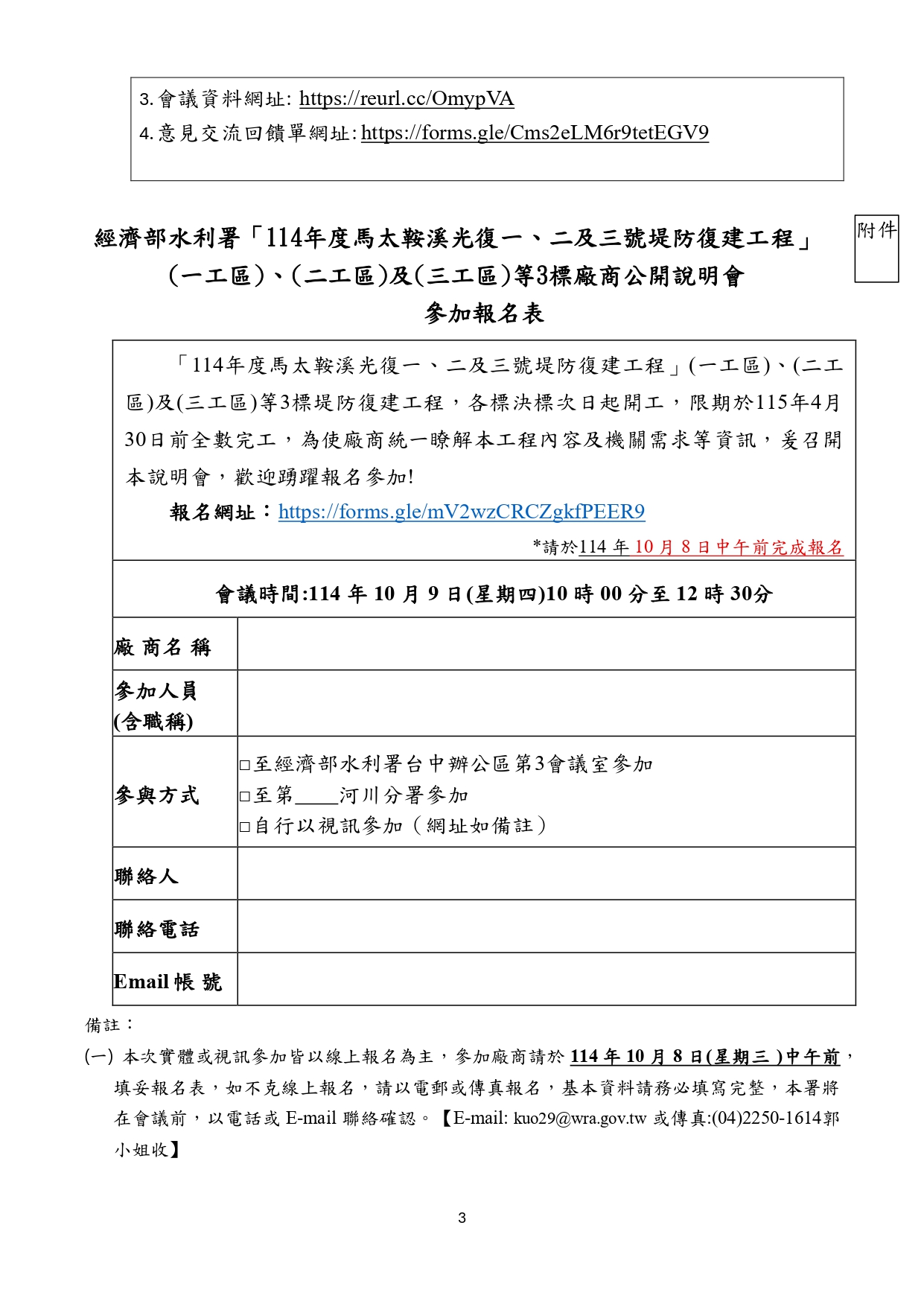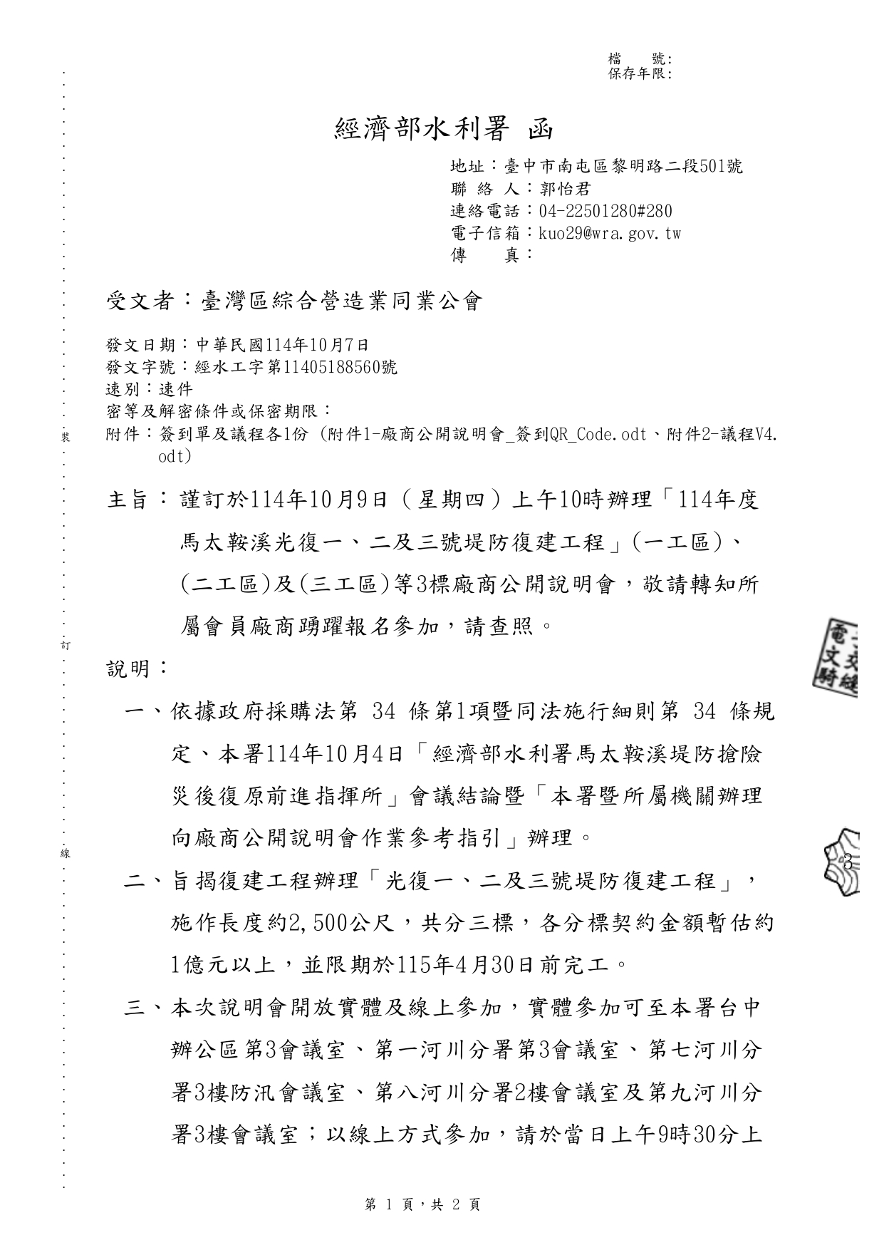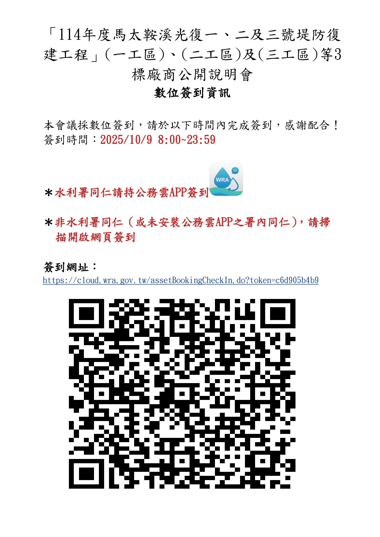 有關114年10月9日(四)上午10時辦理「114年度馬太鞍溪光復一、二及三號堤防復建工程」(一工區)、(二工區)及(三工區)等3標廠商公開說明會」,請轄區會員踴躍報名參加。