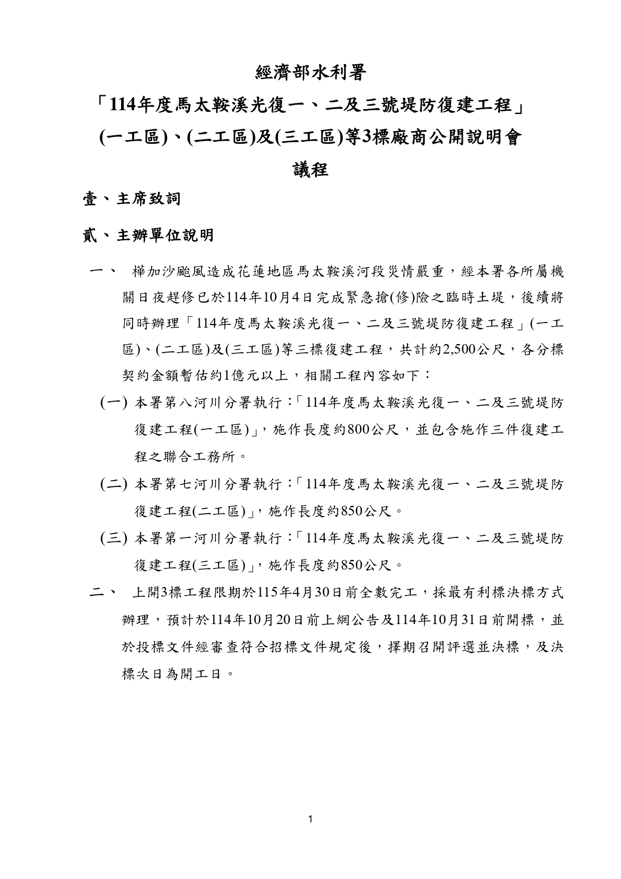 水利署 有關114年10月9日(四)上午10時辦理「114年度馬太鞍溪光復一、二及三號堤防復建工程」(一工區)、(二工區)及(三工區)等3標廠商公開說明會」